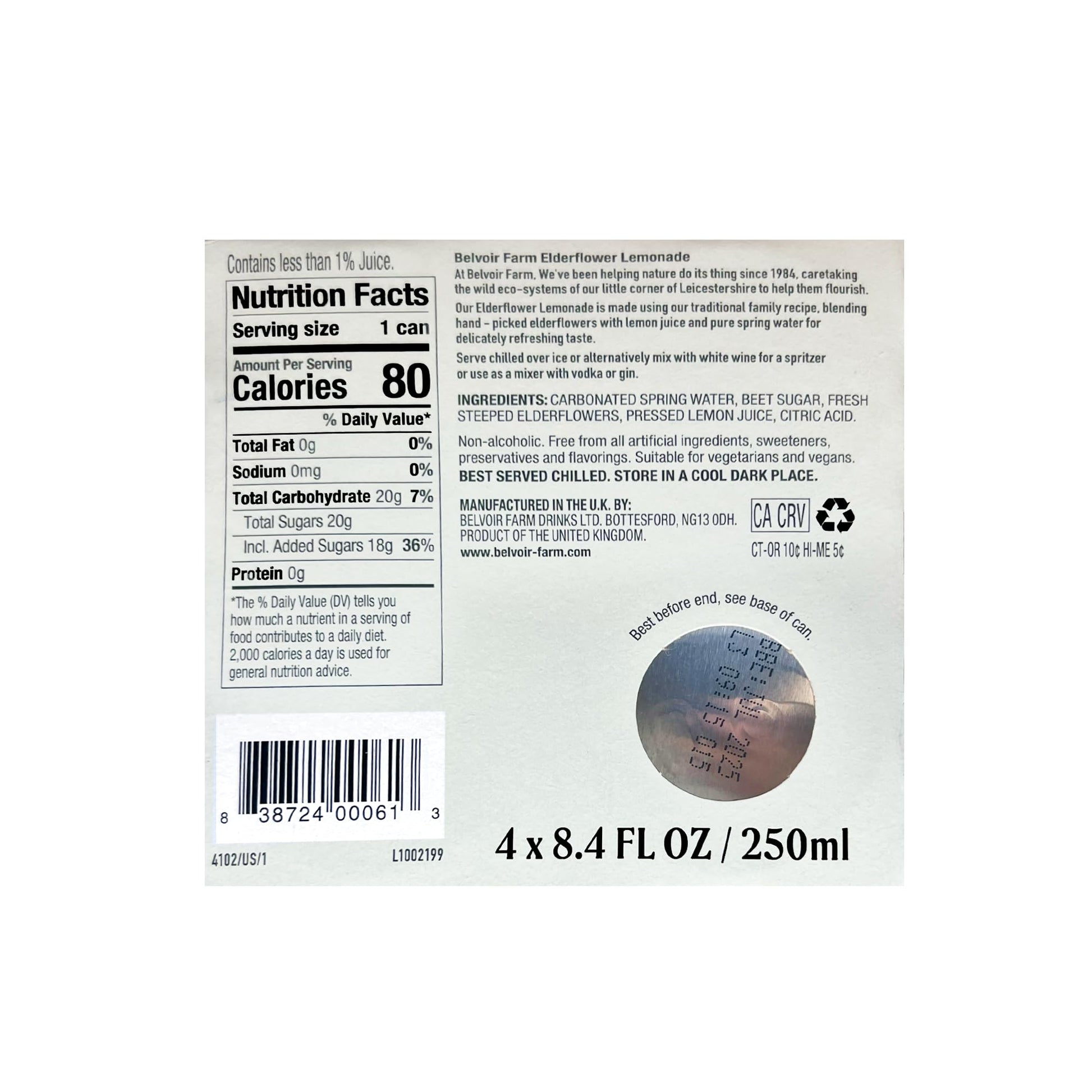 Q: How many cans are included in the Belvoir Farm Elderflower & Rose Sparkling Lemonade pack?A: The pack includes four 8.4 fl oz (250 ml) cans, making it convenient for enjoying at home, on the go, or at gatherings.
