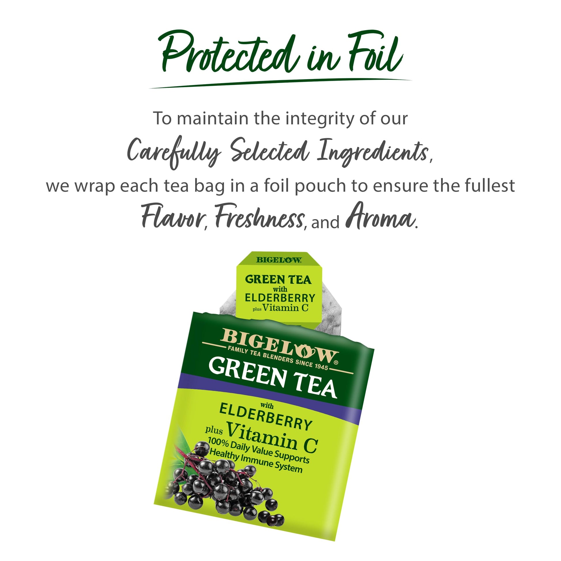 Q: What are the health benefits of Bigelow Green Tea with Elderberry Plus Vitamin C?A: Bigelow Green Tea with Elderberry Plus Vitamin C is designed to support a healthy immune system, thanks to the antioxidant properties of Vitamin C combined with the natural benefits of green tea and elderberry.