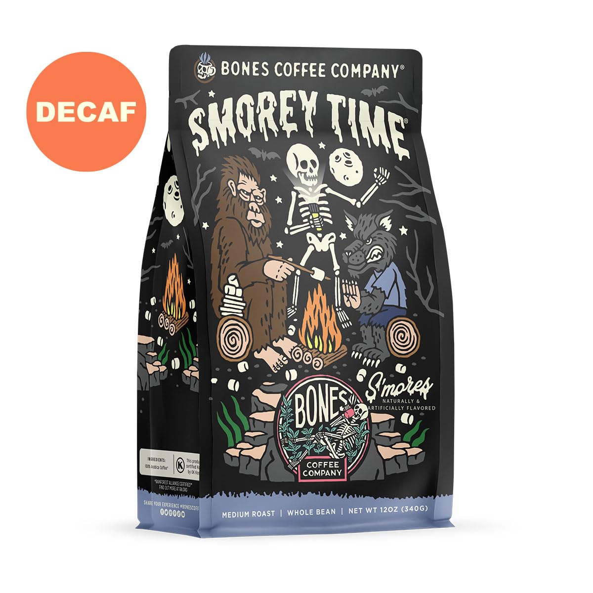 Bones Coffee Company Decaf S'Morey Time Whole Coffee Beans S'Mores And Graham Crackers Flavor, Low Acid Flavored Coffee, Made With Arabica Coffee Beans, Medium Roast Gourmet Coffee (12 Oz)