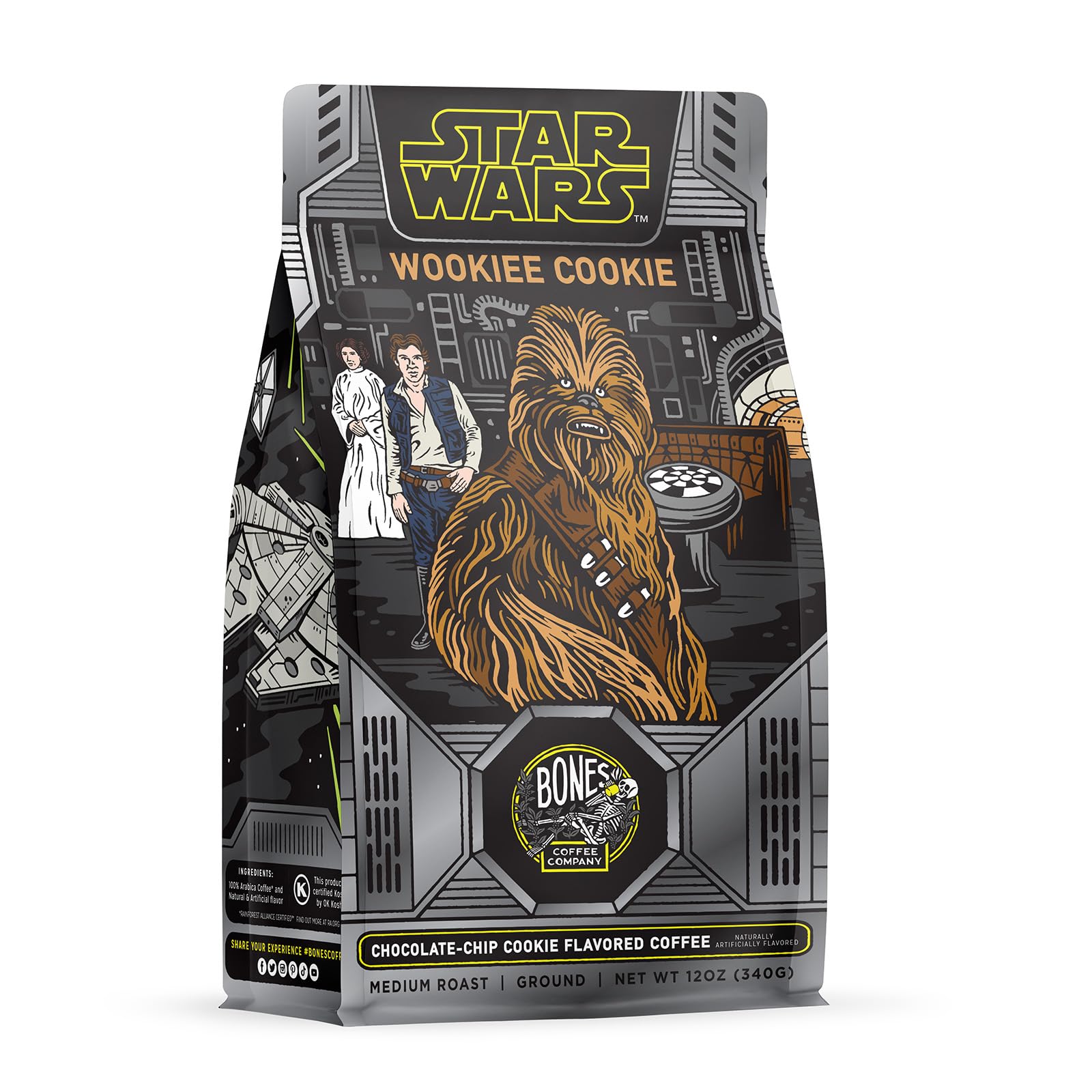 Q: What is the flavor profile of Bones Coffee Company Wookiee Cookie Flavored Coffee?A: The Wookiee Cookie Flavored Coffee features a delightful chocolate chip cookie flavor, providing a smooth and sweet aroma that enhances your coffee experience.