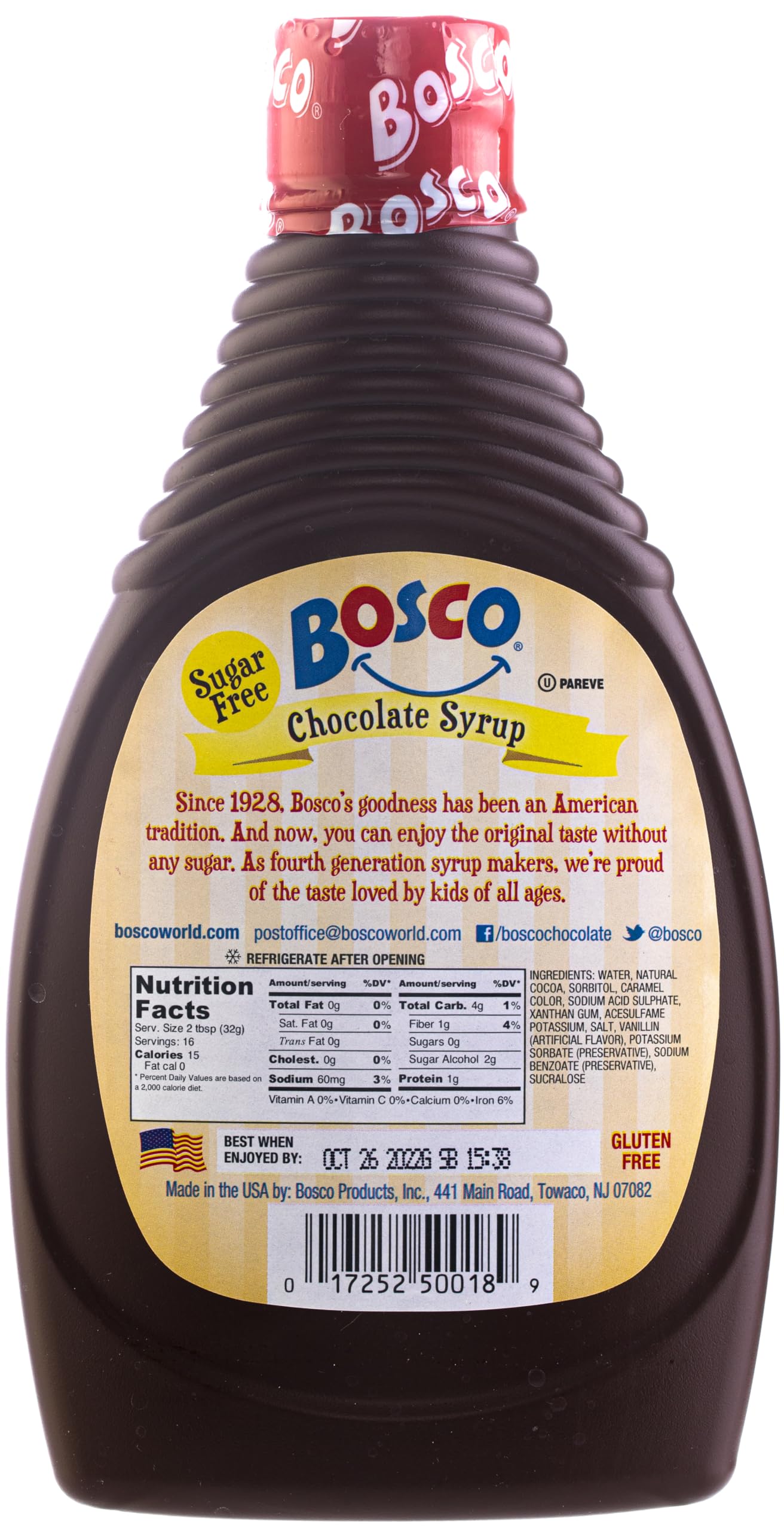 Q: What is the size of the Bosco Sugar Free Chocolate Syrup bottle?A: The Bosco Sugar Free Chocolate Syrup comes in an 18-ounce bottle, making it a convenient size for home use or to share with family and friends.