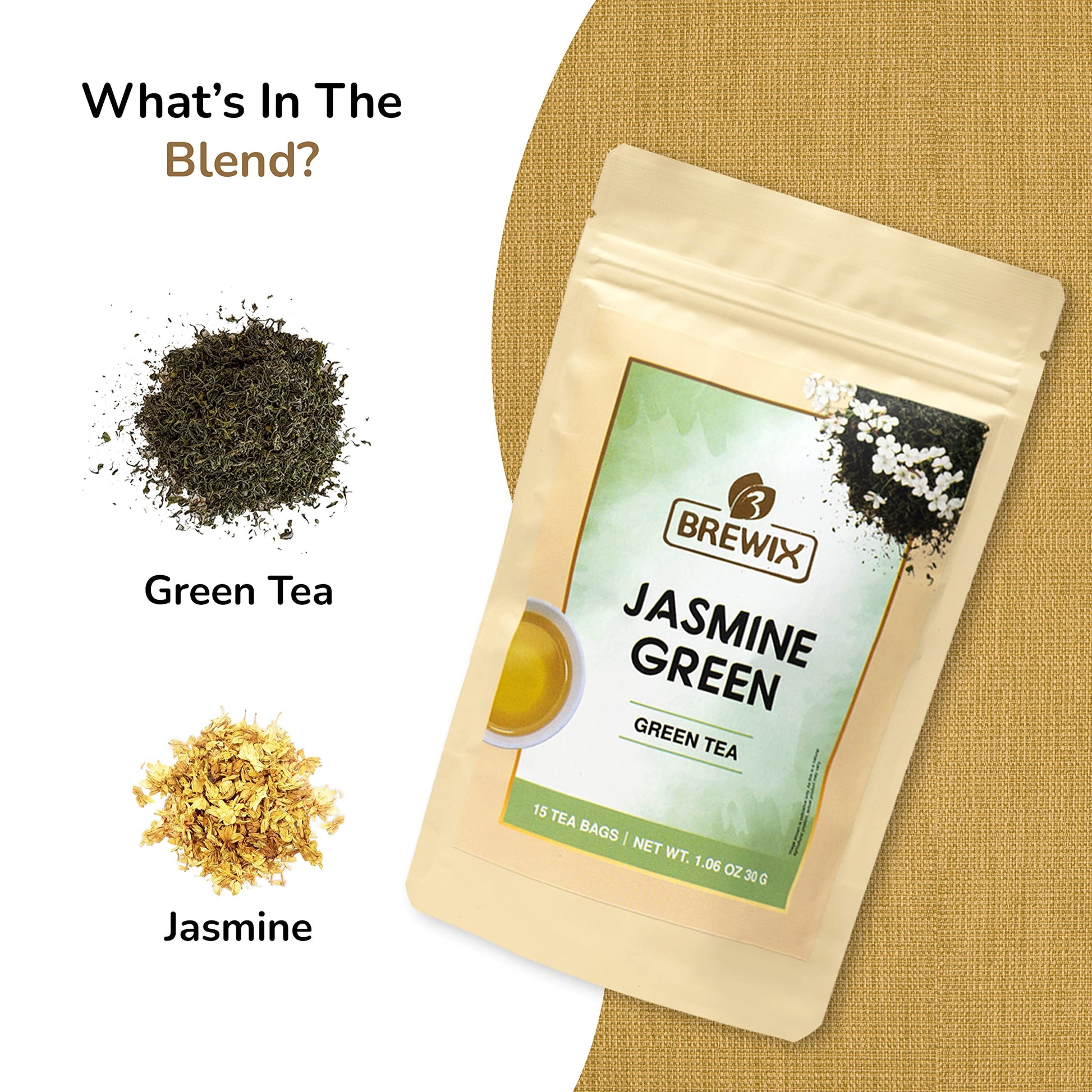 • Q: What are the ingredients in BREWIX Jasmine Green Tea? A: BREWIX Jasmine Green Tea is made with pure ingredients of the highest grade, including high quality green tea leaves and jasmine flowers. The blend is hand selected and hand blended to ensure freshness and optimal flavor.