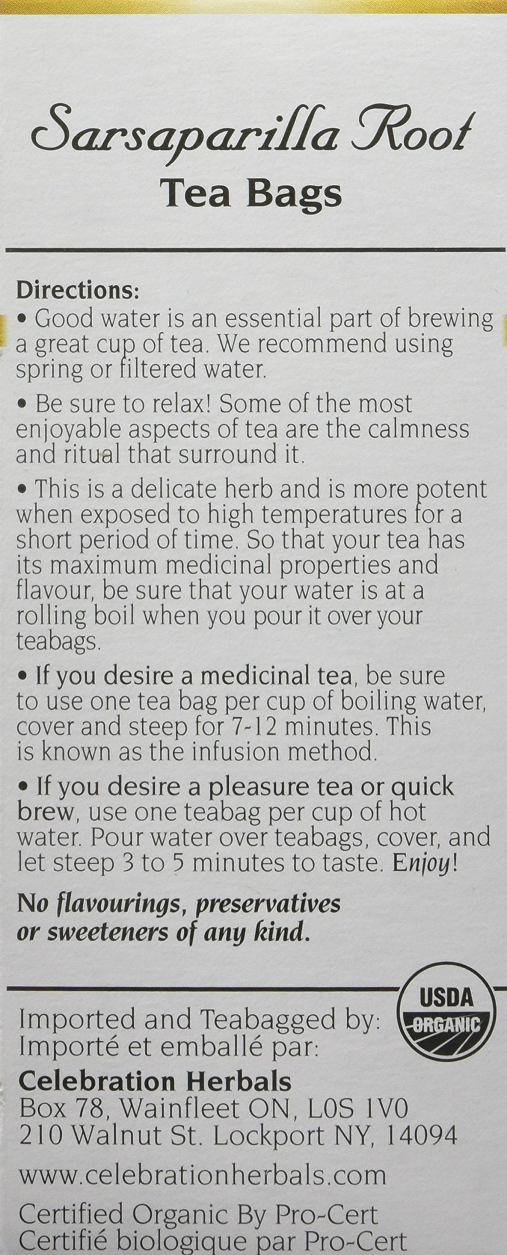 Q: How many tea bags are included in the Celebration Herbals Sarsaparilla Root Tea package?A: The Celebration Herbals Organic Sarsaparilla Root Tea comes with 24 tea bags in each package, making it convenient for regular use.