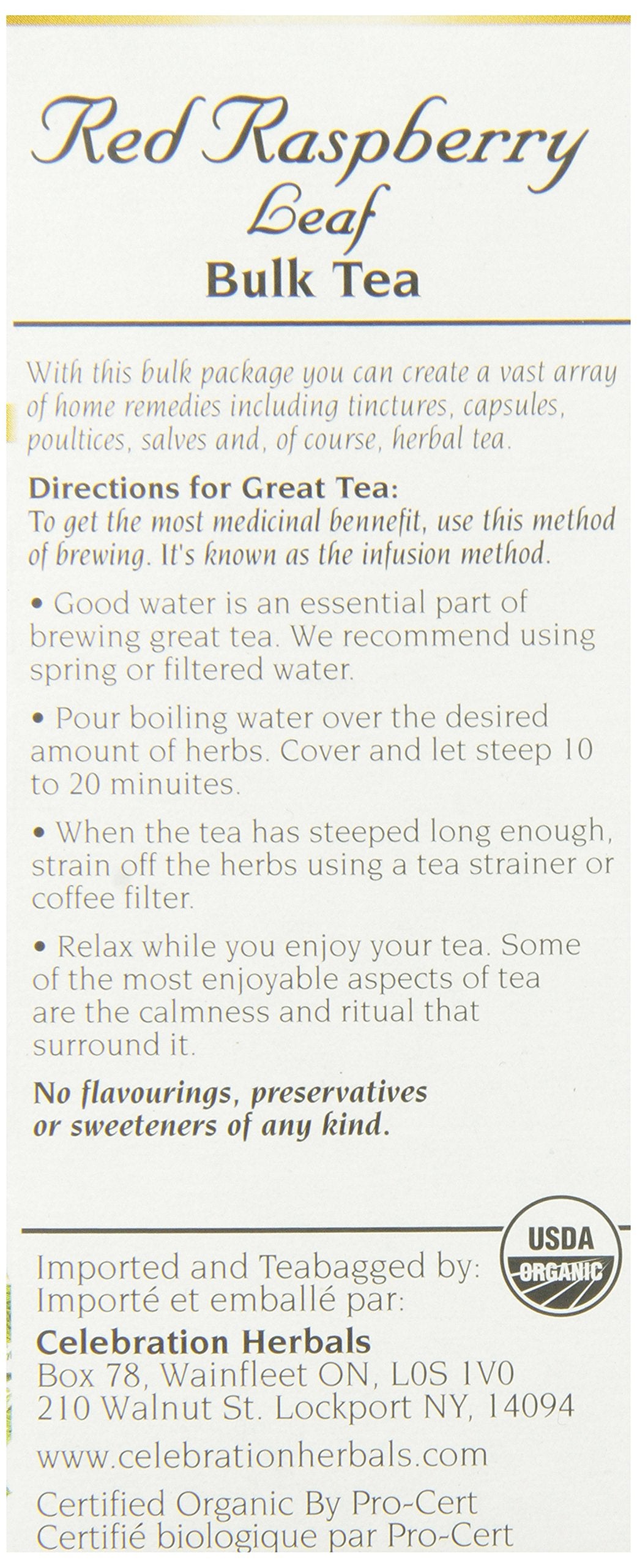 - Q: Is Celebration Herbals Red Raspberry Leaf tea organic? A: Yes, this product is certified organic. Celebration Herbals ensures that their herbs are cultivated without chemicals, following strict organic farming practices from cultivation to packaging.