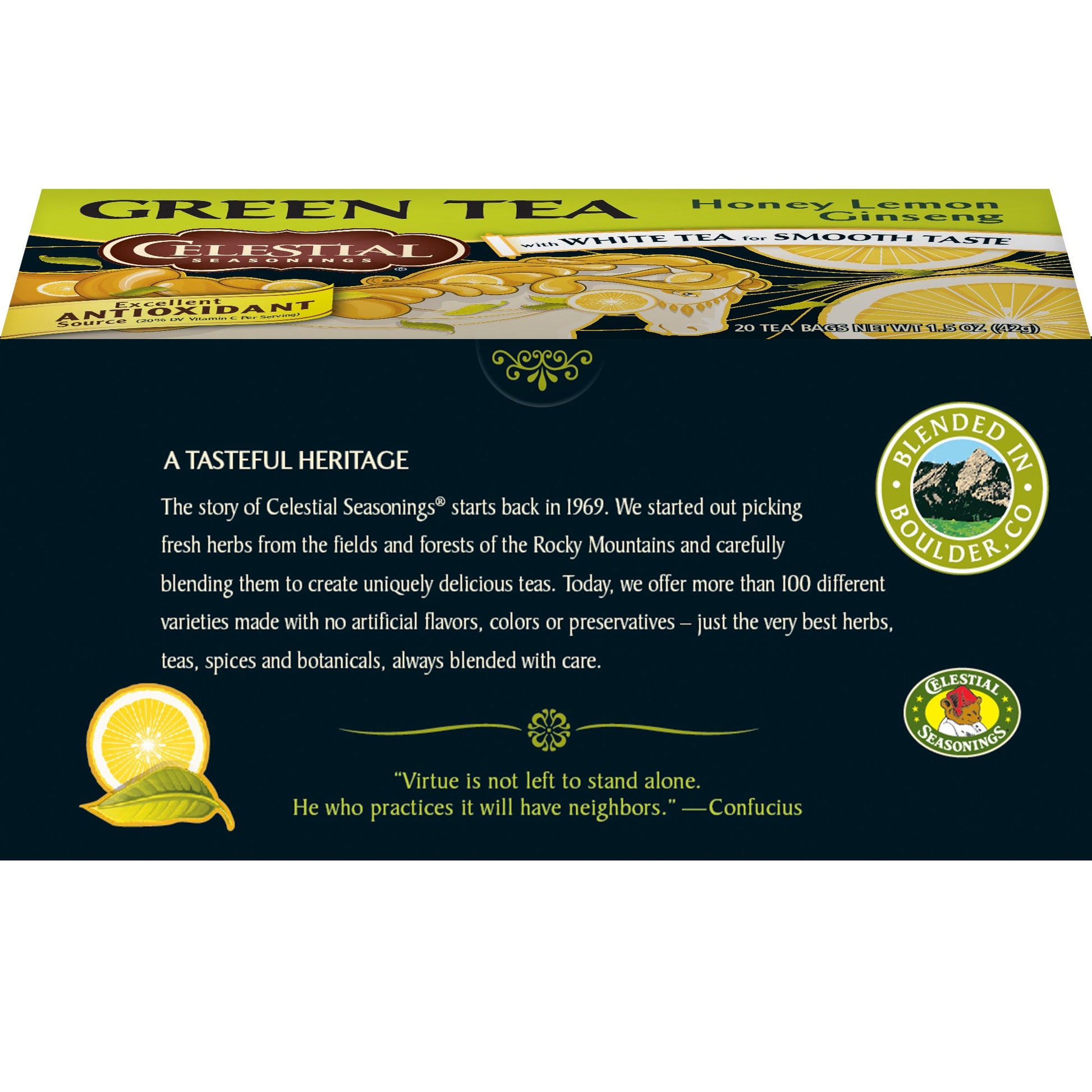 - Q: What are the health benefits of Celestial Seasonings Green Tea, Honey Lemon Ginseng? A: Celestial Seasonings Green Tea, Honey Lemon Ginseng is rich in antioxidant vitamin C, which supports your everyday wellness. The blend of green tea and botanicals provides a refreshing flavor while delivering a moderate caffeine content of 25 mg per serving, making it a great choice for a gentle energy boost.