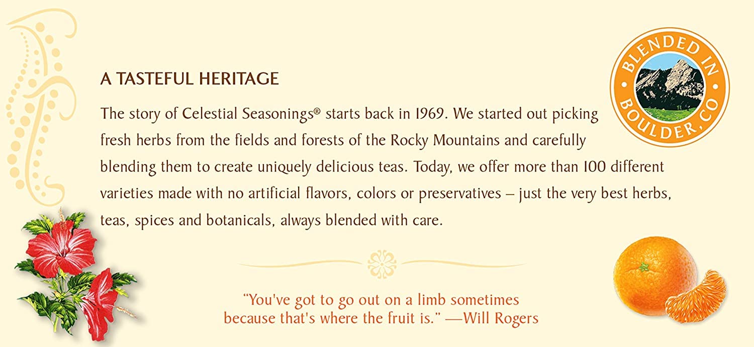 Q: Does this herbal tea contain any artificial colors or preservatives?A: No, Celestial Seasonings Tangerine Orange Herb Tea is free from artificial colors and preservatives, ensuring a natural and pure tea experience.