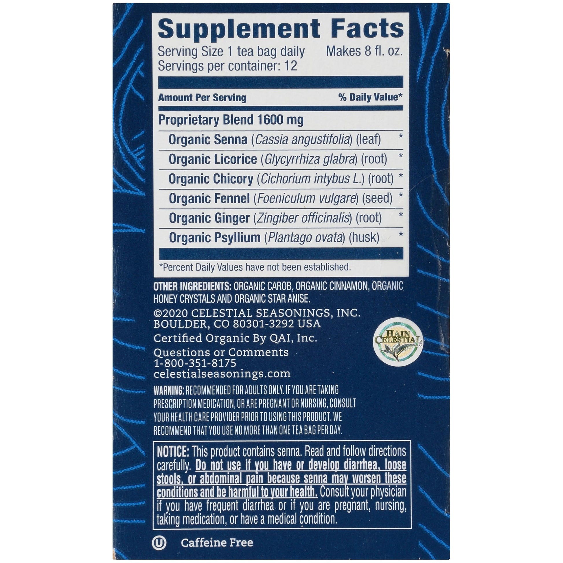 - Q: What are the main ingredients in Celestial Seasonings TeaWell Herbal Tea, Laxative, Organic Carob Licorice? A: The main ingredients include roasty carob, sweet licorice, ginger, fennel, chicory root, organic Senna, and psyllium leaves, all known for their digestive wellness properties.