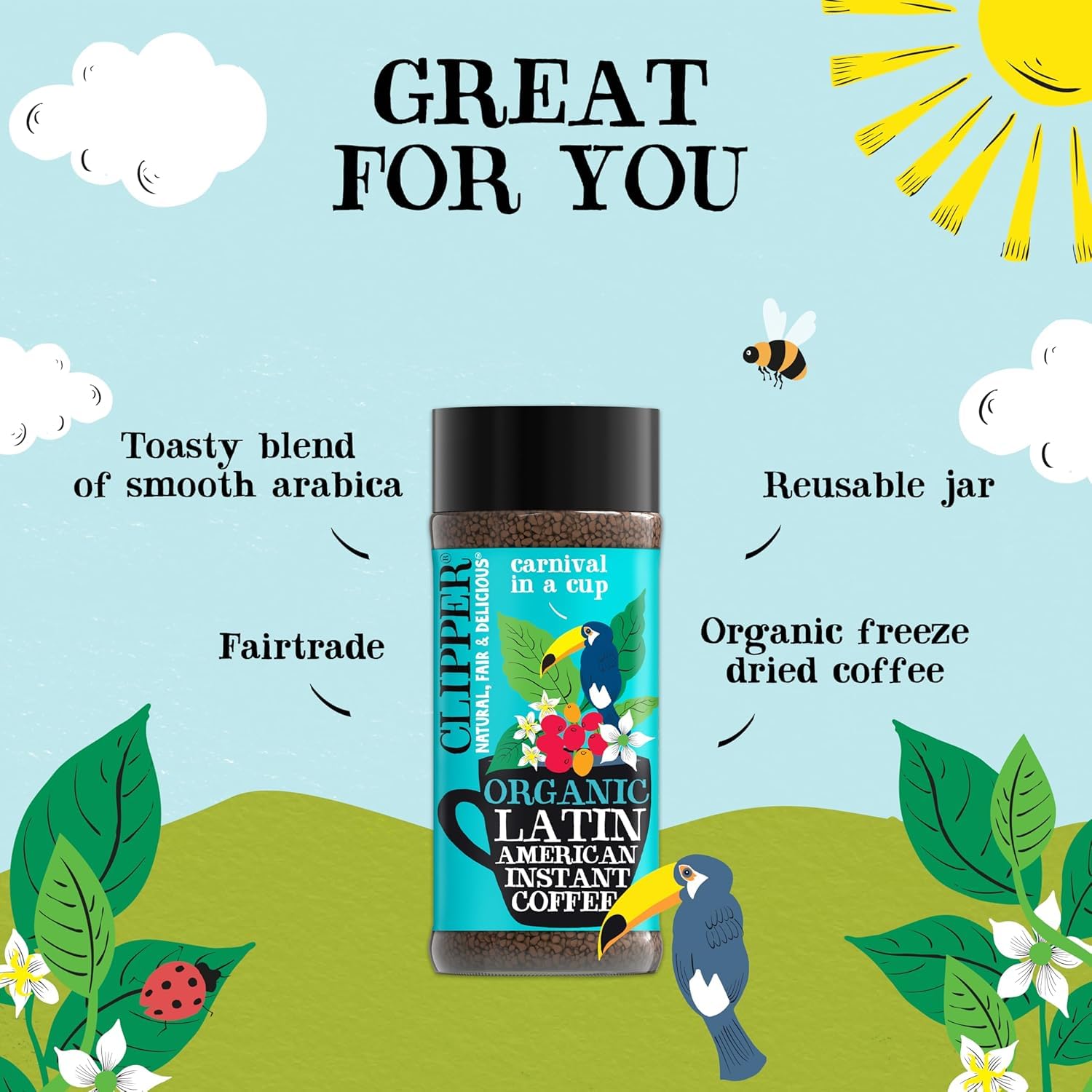 - Q: What makes Clipper Coffee's Organic Latin American Instant Coffee unique? A: Clipper Coffee's Organic Latin American Instant Coffee stands out due to its ethically sourced, high-quality Latin American Arabica beans, which provide a smooth and rich flavor profile. The medium roast is designed to deliver a delightful coffee experience in an instant, making it perfect for those who value both taste and ethics.