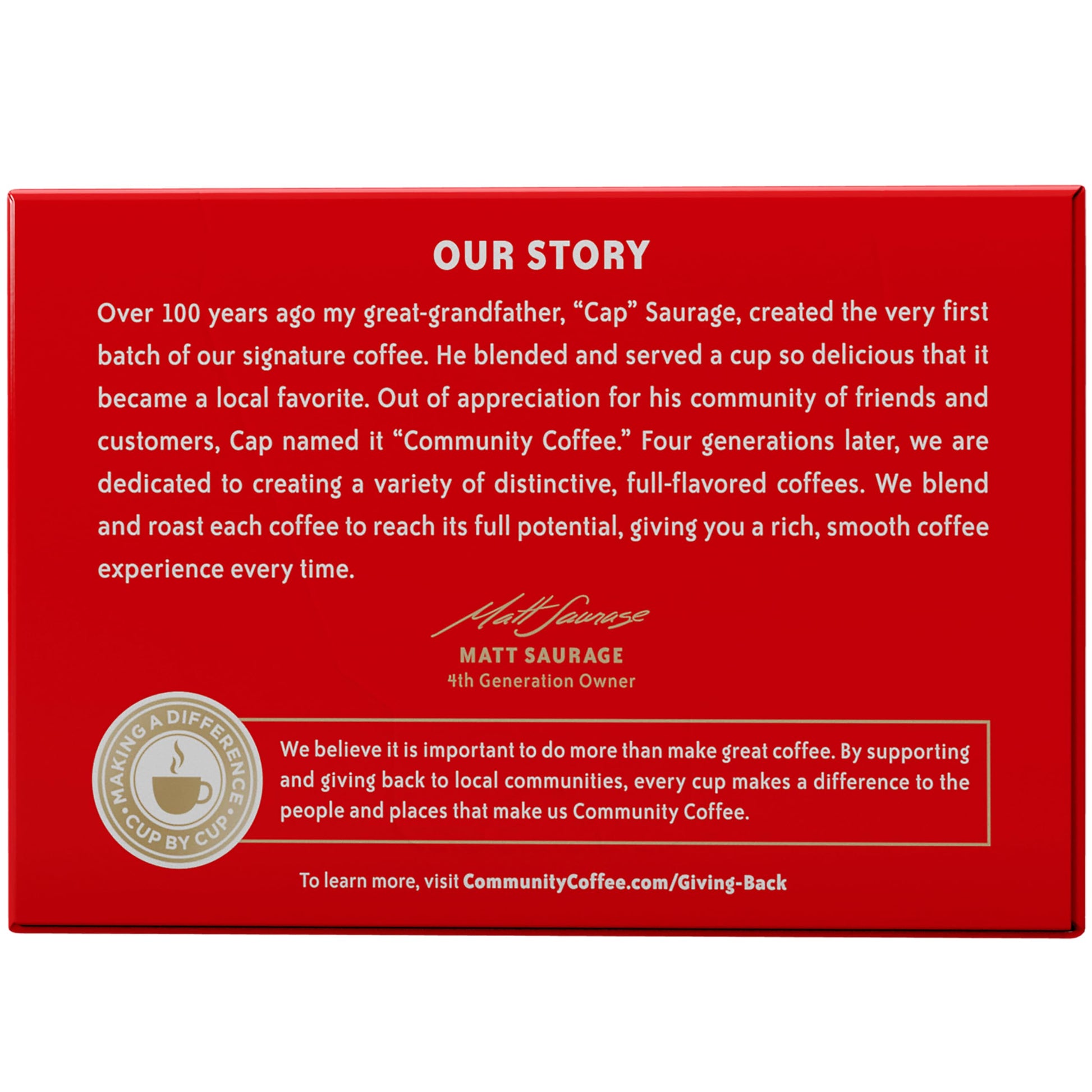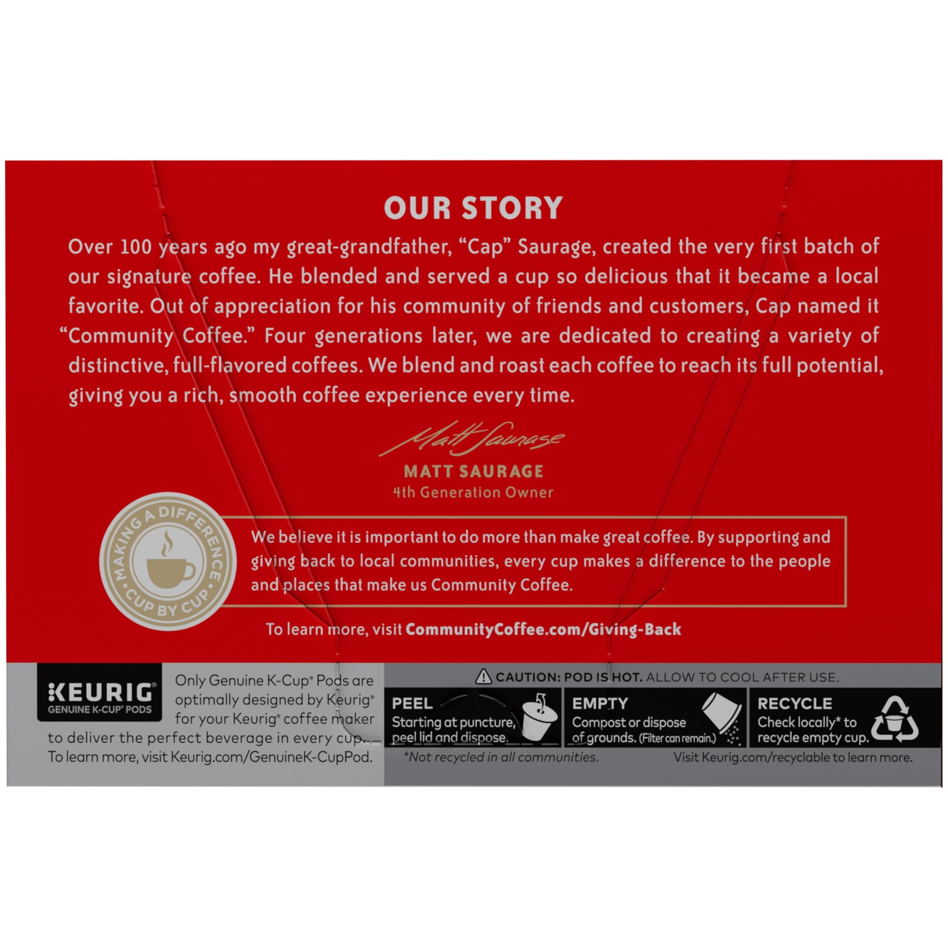 Over four generations ago, our founder ""Cap"" Saurage created our signature dark roast coffee. This special blend is roasted dark to develop rich, smooth flavor with a deep chocolate profile. Our master roasters ensure the exact roast level is achieved to consistently create this deliciously complex coffee that remains a favorite today. This product contains a single pack of 12 single serve coffee pods (Keurig compatible K-Cups™). Enjoy 12 cups of coffee. About Community Coffee Since Cap blended the first batch of Community® coffee, we’ve seen plenty of change — both inside and outside the company. We’ve evolved to better serve our customers, but we’ve also tried to stay true to our roots and the community that got us started. That’s why for over 100 years we’ve maintained an unwavering dedication to making the best-tasting, highest-quality coffee we possibly can — all while developing better methods of sourcing, superior roasting techniques and innovative ideas to keep our coffee at its peak of flavor and freshness. We simply love making coffee, and we find inspiration in every part of the process, from planting the beans to serving the perfect cup. Above all, we're inspired by the people we work with, the customers we serve and the connections we’ve built together.