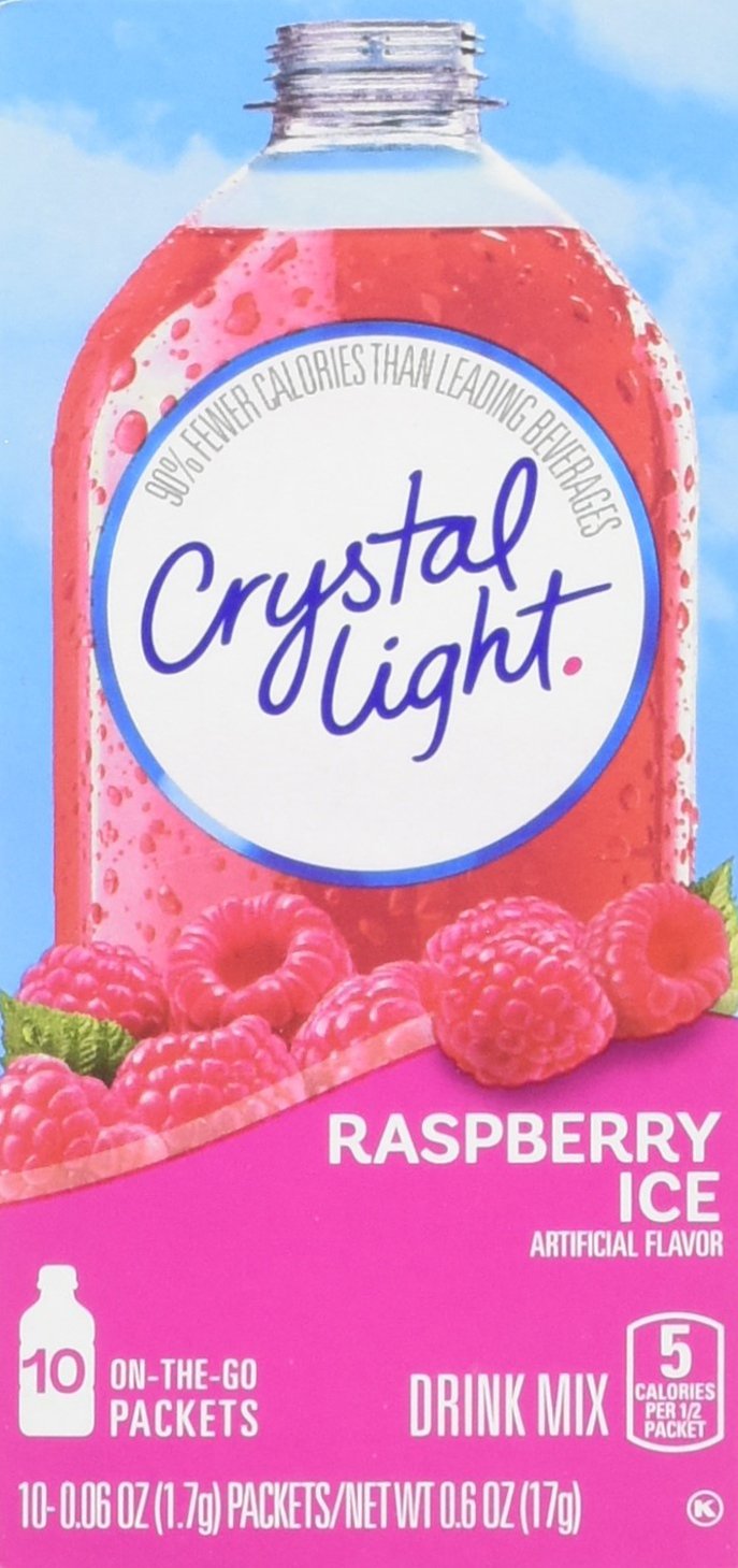 Crystal Light Sugar Free Raspberry Ice Powdered Drink Mix is a deliciously fruity drink you can enjoy anywhere. With zero grams of sugar and 5 calories per serving, Crystal Light fruit drink mix is a sweet alternative to juice and soda and has 90 percent fewer calories than leading beverages (this product 5 calories, leading beverages 70 calories), so you dont have to choose between taste and calories. This 0.06 ounce individual fruit drink packet fits easily in your bag, desk, or car, so you can enjoy a refreshing glass of Crystal Light anywhere. Simply empty one packet of powdered fruit drink mix into a bottle of water or a glass with 2 cups of water, shake or stir, and enjoy! All the flavor and only 5 calories per serving... just the way you like it.