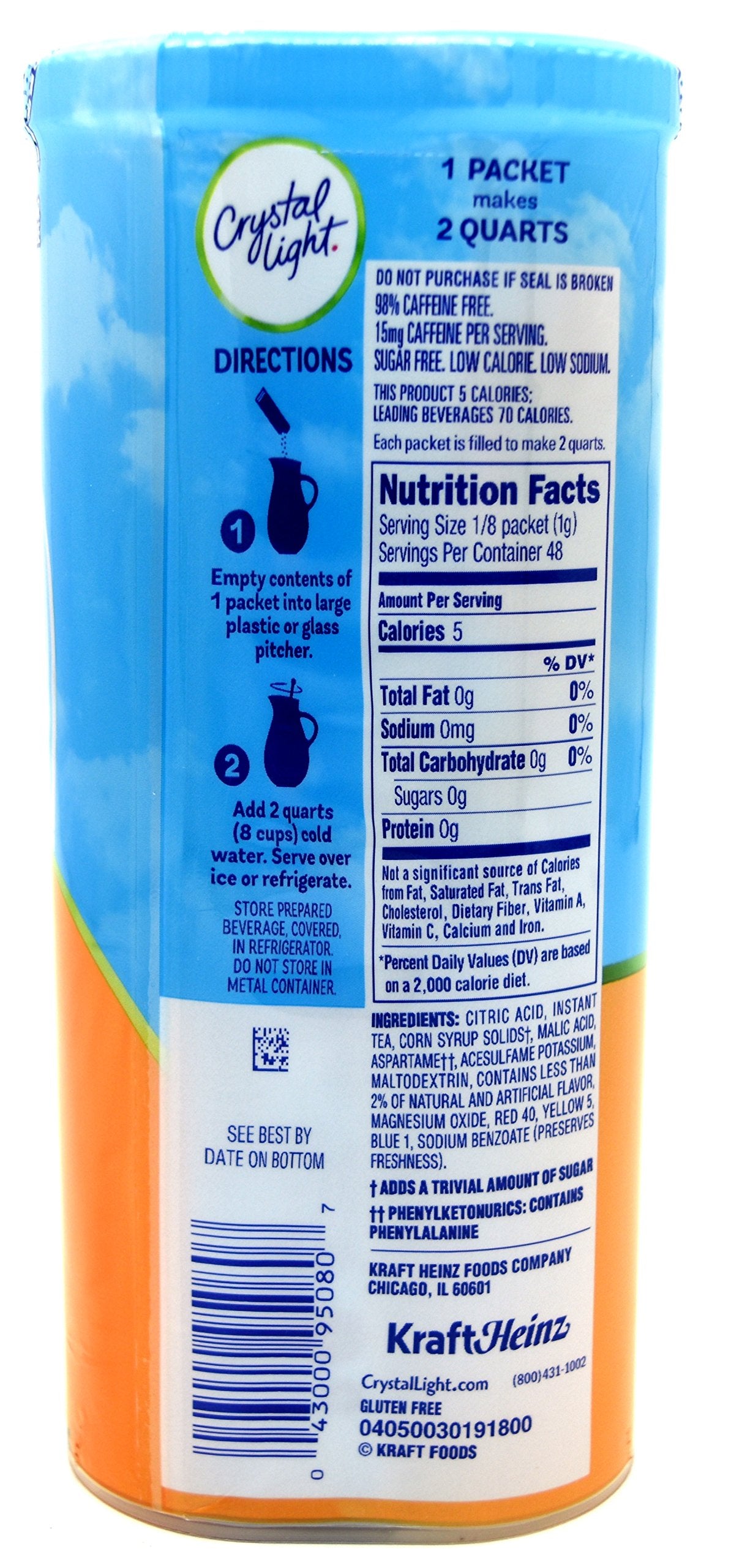 Crystal Light Peach Tea Drink Mix comes in a 1 ounce pack. It contains instant tea, corn syrup solids, contains less than 2 percent of natural and artificial flavor. Choose from luscious fruity favorites, decaffeinated tea and green tea with anti-oxidants vitamins A, C and E for a low- calorie way to water your body. Crystal Light, and the international version, Clight, are low-calorie, fruit-flavored refreshment beverages. They are available in both powdered and ready-to-drink varieties. Crystal Light and Clight On The Go are single-serve packets of powder that can be added to bottled water for a tasty drink anytime, anywhere.