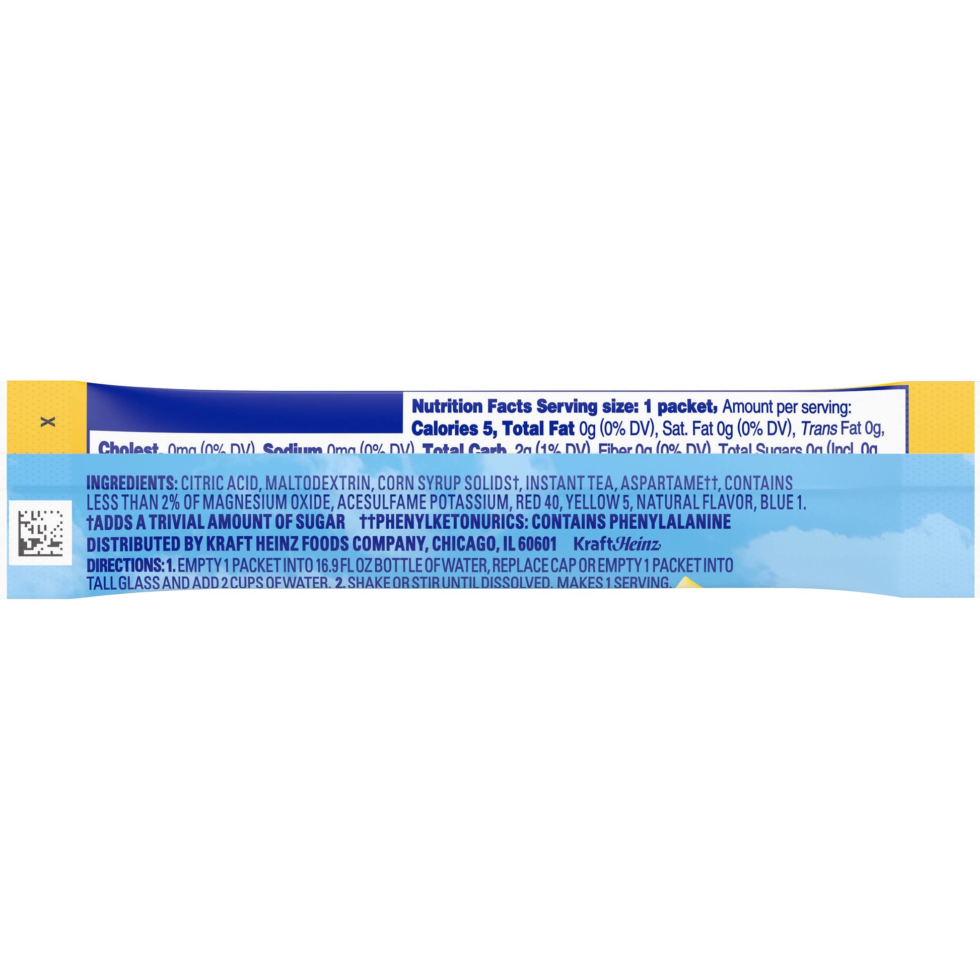 Crystal Light Lemon Iced Tea Naturally Flavored Sugar Free Powdered Drink Mix Singles are a refreshing, health-forward option for on-the-go hydration. With zero grams of sugar and 5 calories per serving, Crystal Light Lemon Iced Tea Drink Mix Singles are a sweet alternative to juice and soda that you can feel good about. With small, individual single-serve packets that can easily fit in a pocket, bag or desk drawer, Crystal Light Drink Mix Singles are a great choice for any busy lifestyle. Enjoy a delicious glass of Crystal Light anywhere — simply empty one sugar free drink mix packet into a bottle of water or a glass with 2 cups of water, shake or stir, and enjoy! A convenient option for work, travel, on-the-go or post-workout, Crystal Light Lemon Iced Tea Naturally Flavored Sugar Free Powdered Drink Mix contains ten 0.07 oz. individual drink mix packets per box. All the flavor and only 5 calories per serving, just the way you like it.