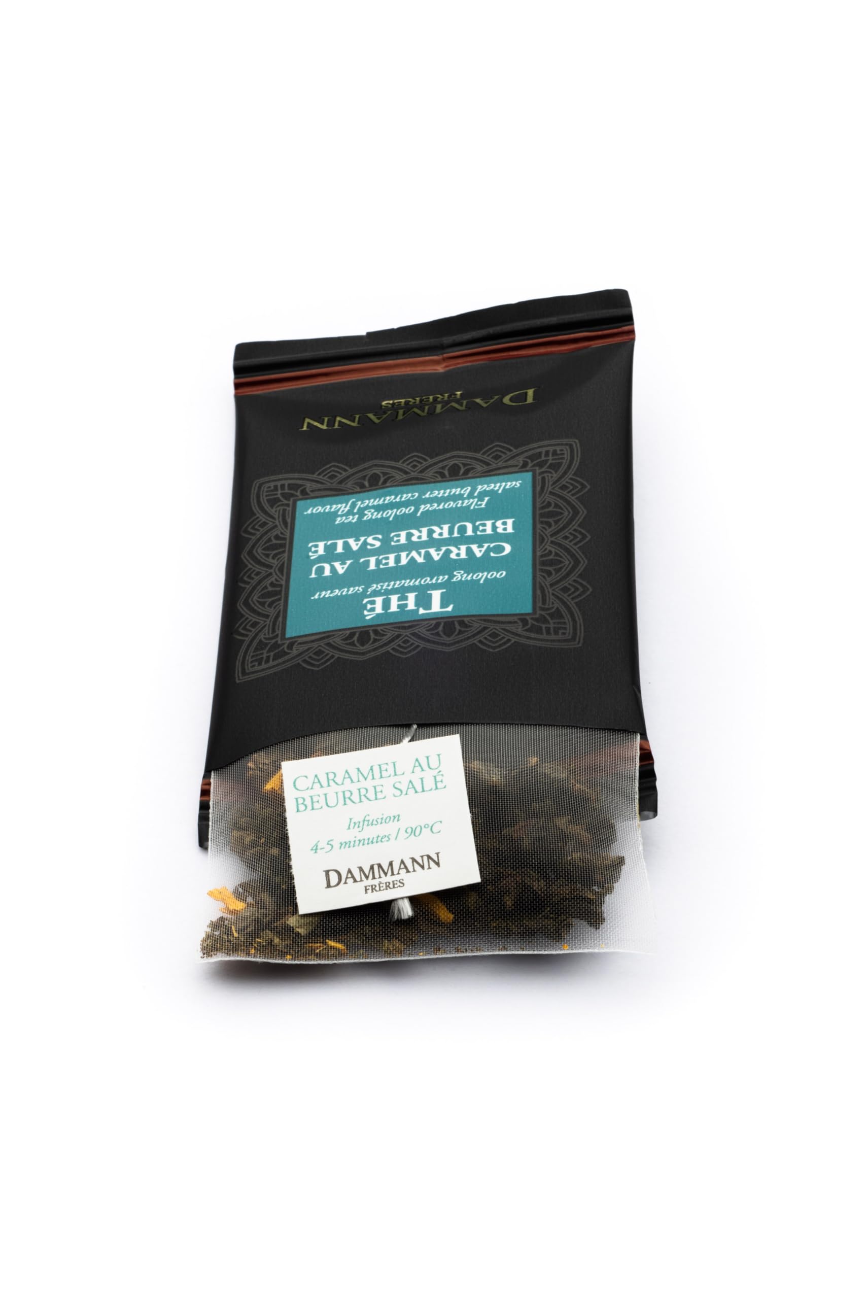 Q: What flavors can I expect from Dammann Freres Caramel au Beurre tea?A: The Dammann Freres Caramel au Beurre tea features a delightful blend of velvety oolong with sweet-salty caramel notes, providing a beautifully balanced flavor profile that combines green and candy-like undertones.