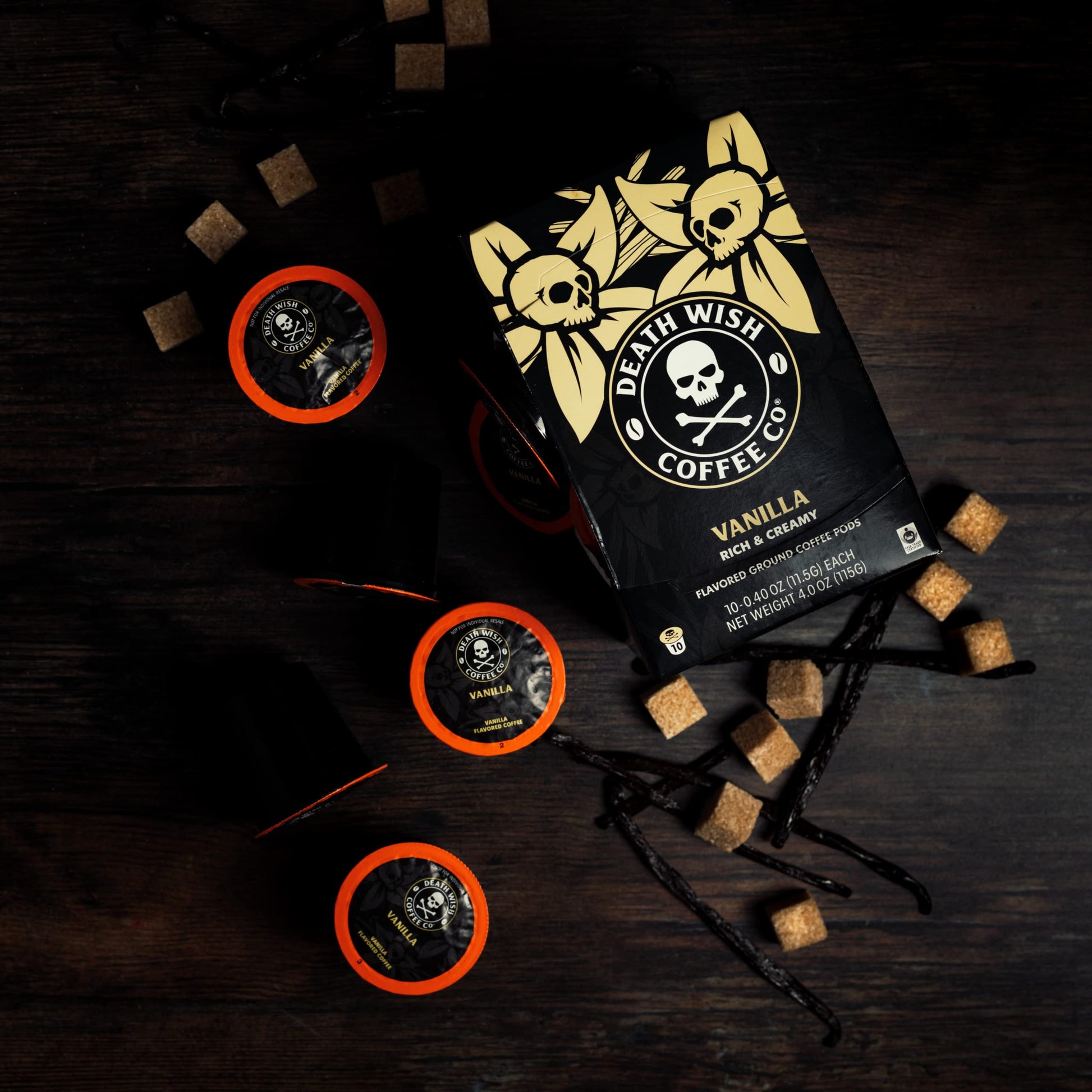 Q: What flavors are available in Death Wish Coffee Co. single serve coffee pods?A: The Death Wish Coffee Co. single serve coffee pods are available in a rich Vanilla flavor that offers a balanced and smooth taste with no artificial ingredients.