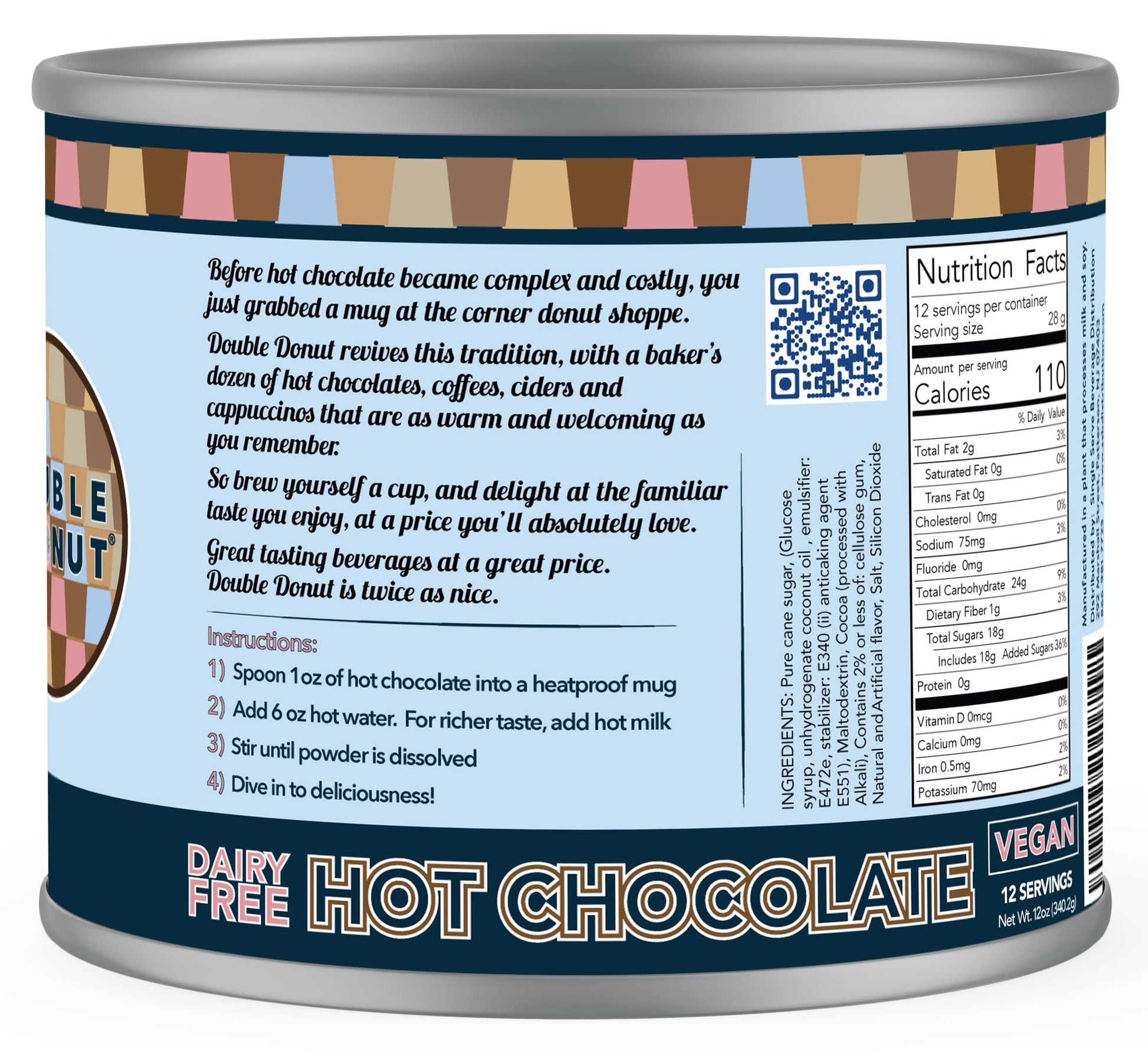 Q: Is the Double Donut Dairy Free Hot Chocolate Mix suitable for vegans?A: Yes, the Double Donut Dairy Free Hot Chocolate Mix is a non-dairy instant vegan hot chocolate mix, making it suitable for vegan diets.