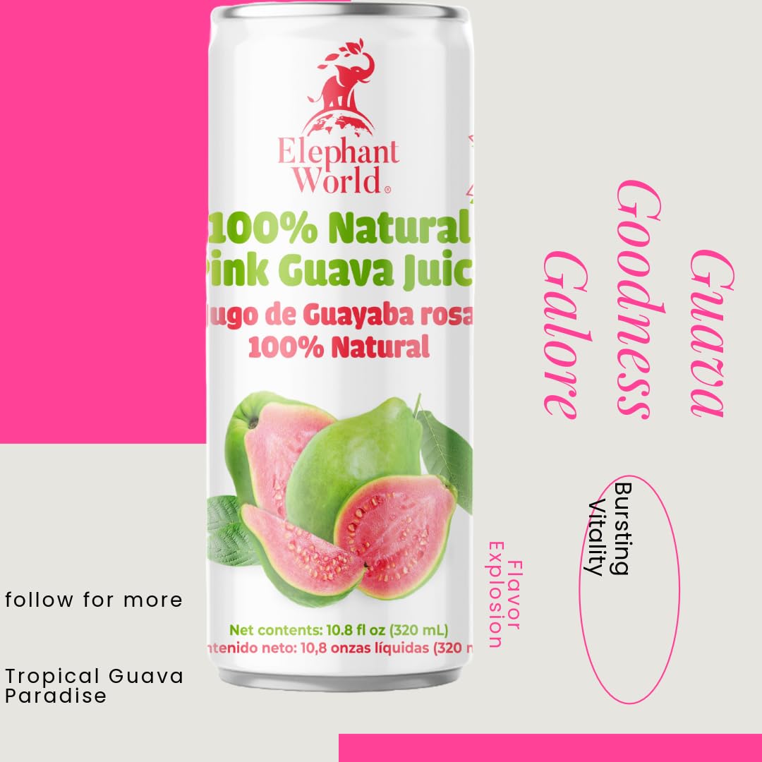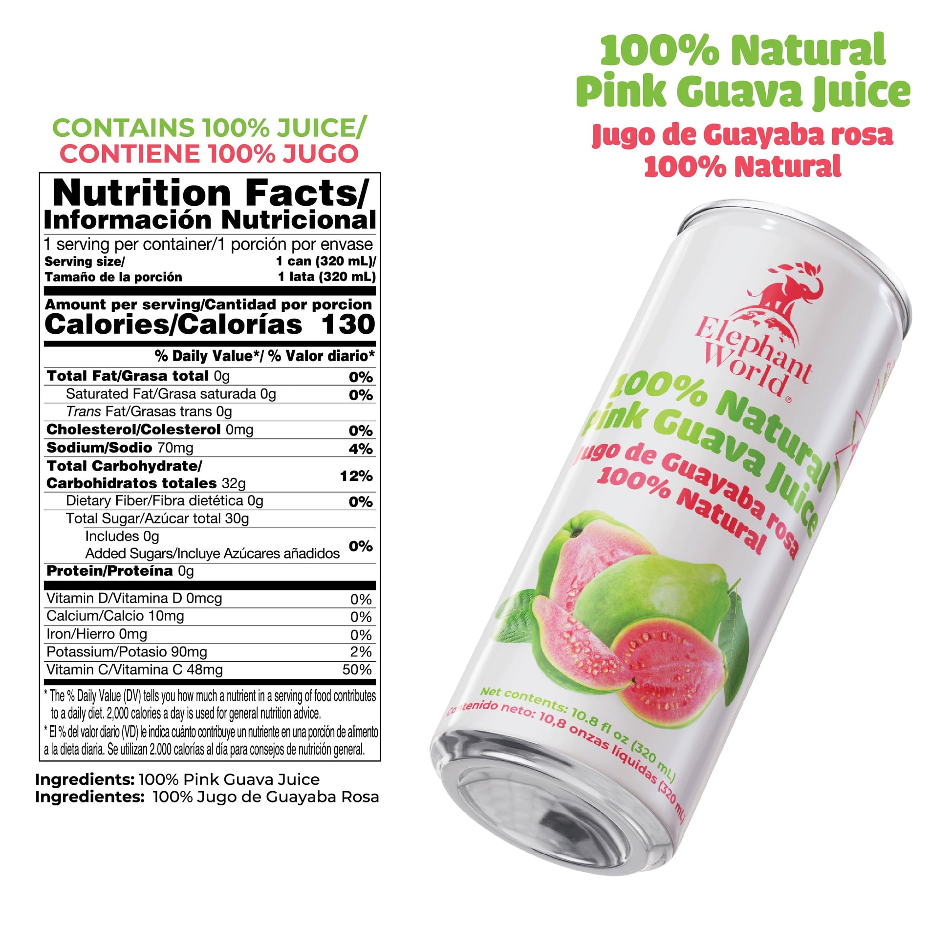 Q: What are the main ingredients in Elephant World Guava Juice?A: Elephant World Guava Juice is made from 100% natural guava, with no sugar added. It features real guava pulps and is not made from concentrate, ensuring a fresh taste that resembles drinking directly from the fruit.