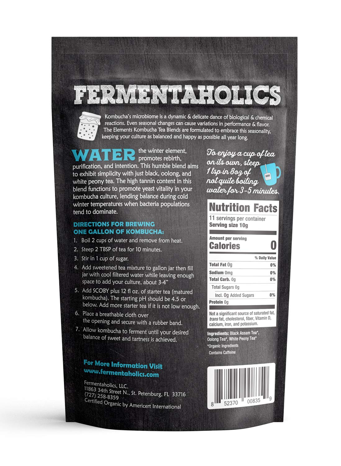 The Best Kombucha Starts With The Best Ingredients. Our Tea Blends Are Organic And Blended By Hand, With Love. Perfect For Brewing Kombucha, Or For Just An Energizing, Delicious Cup Of Tea. Assam Black Tea - Usda Certified Organic Oolong Tea - Usda Certified Organic White Peony Tea - Usda Certified Organic Water, The Winter Element, Promotes Rebirth, Purification, And Intention. This Humble Blend Aims To Exhibit Simplicity With Just Black, Oolong, And White Tea. The High Tannin Content In This Blend Functions To Promote Yeast Vitality In Your Kombucha Culture, Lending Balance During Cold Winter Temperatures When Bacteria Populations Tend To Dominate. Our 4Oz Usda Certified Organic Element Kombucha Tea Blends Will Make Up To 12 Gallons Of Tea. This Tea Blend Is Also Kosher Certified. The Fermentaholics Support Team Is A Fellow Group Of Fermentation Fanatics. We Love To Talk About Fermentation And Help Each Other Learn, Grow, And Experiment With Different Techniques And Flavors. Reach Out To Have Any Of Your Fermentation Questions Answered! By Purchasing Our Products, You Are Instantly A Part Of An Ever-Growing Community Of Fermenters Like Yourself. Welcome To Our Fermenting Family!