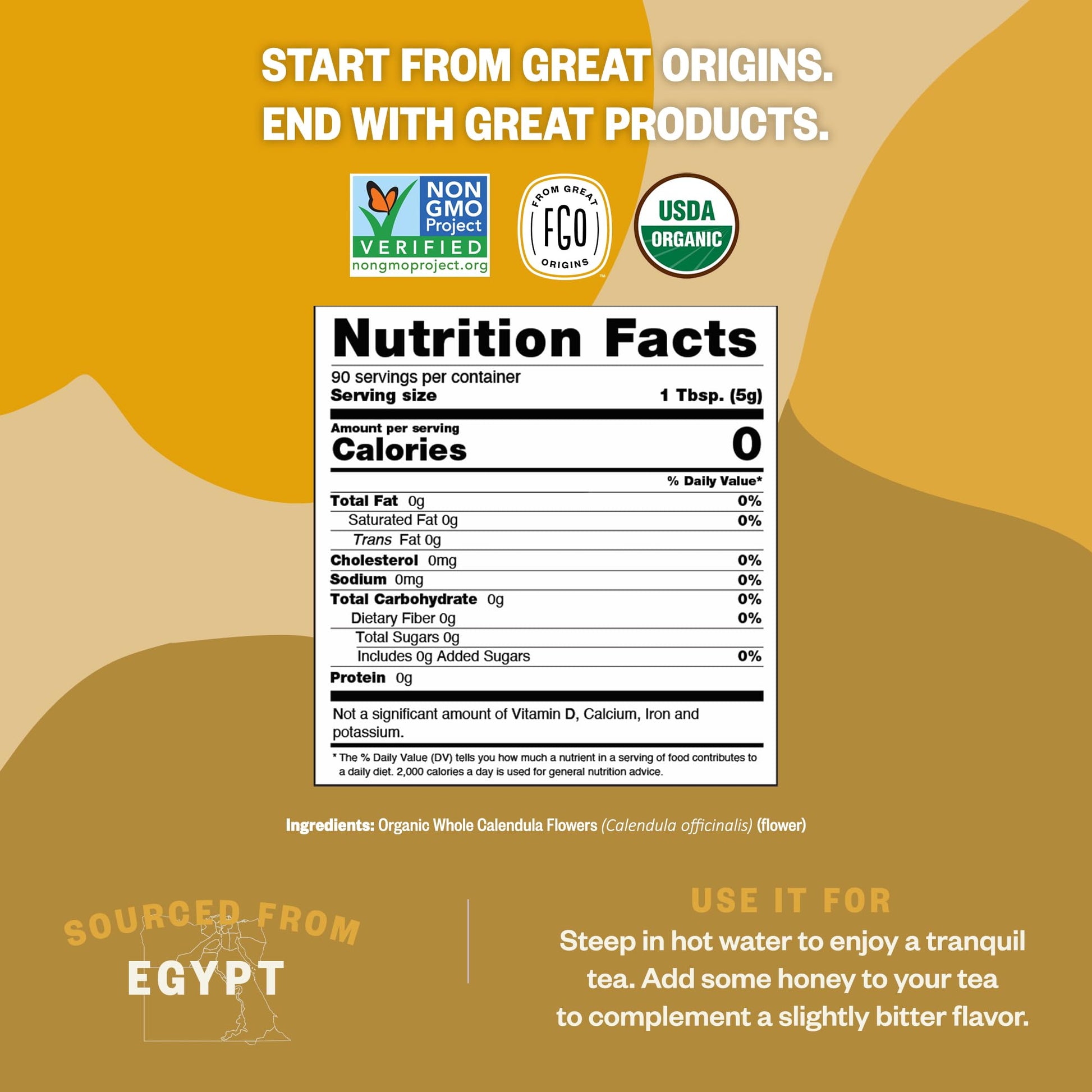 - Q: Where are FGO Organic Calendula Flowers sourced from? A: FGO Organic Calendula Flowers are imported from Egypt, where they are grown under organic farming practices. The sunny climate contributes to the vibrant color and quality of the flowers.
