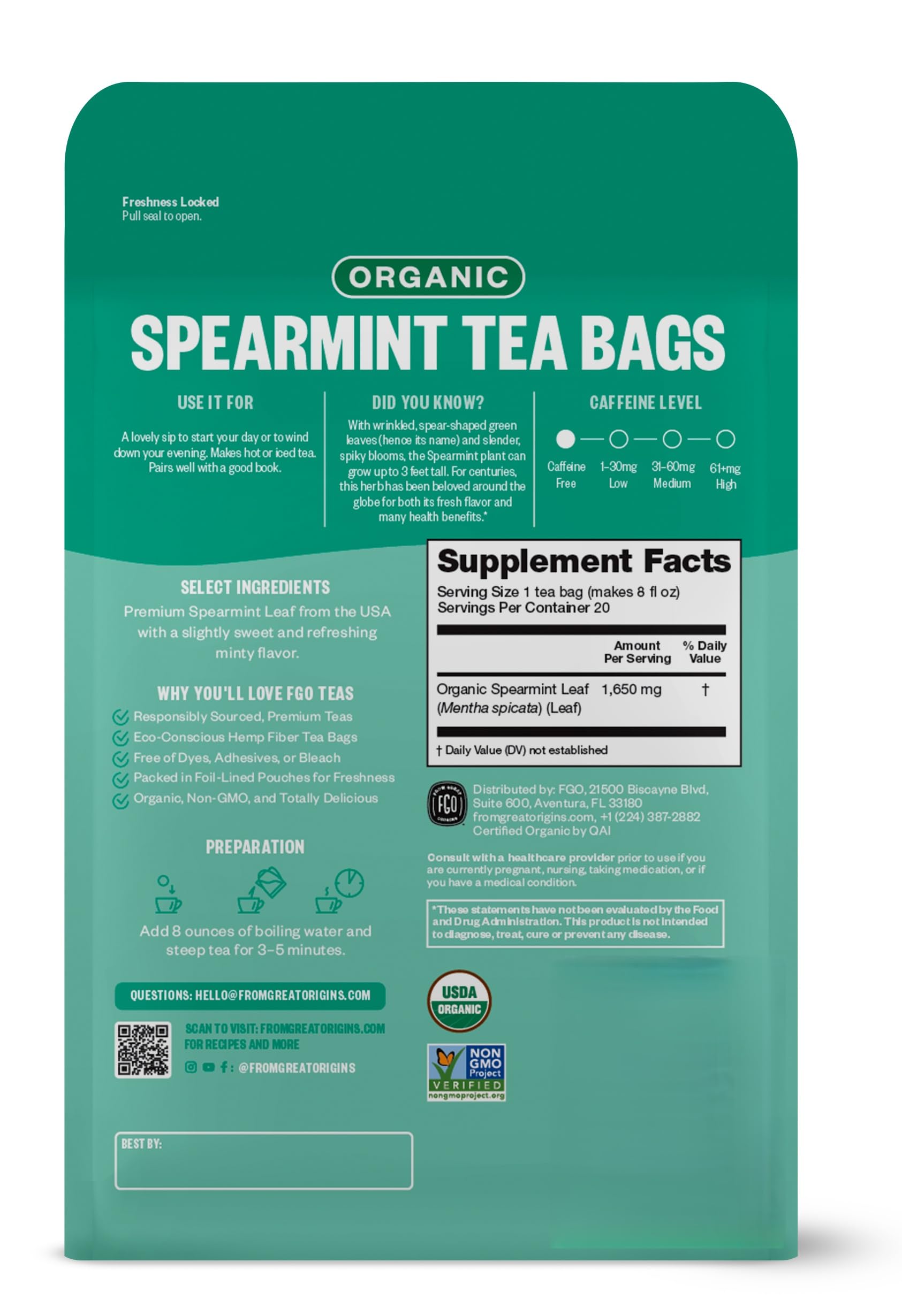 Q: What are the ingredients in FGO Organic Spearmint Leaf Herbal Tea?A: FGO Organic Spearmint Leaf Herbal Tea contains premium spearmint leaf sourced from the USA. It is free from additives and is certified USDA Organic and Non-GMO.