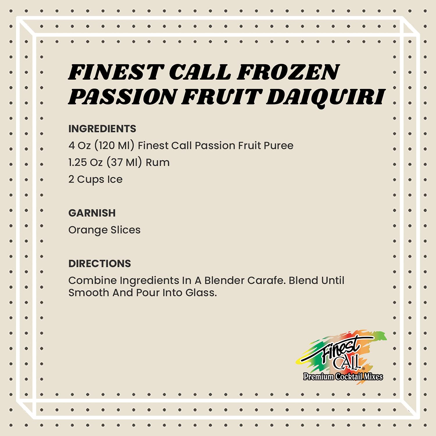 The Finest Call Premium Fruit-Intensive Puree Mixes Feature The World'S Finest Fruit And The Perfect Touch Of All Natural Sweetener, Gently-Processed To Create A Burst Of Unmatched ''True To Fruit'' Taste And Aroma For Daiquiris, Margaritas, Mojitos, Martinis, Teas, Smoothies, Lemonades, Margaritas And More.Spark Your Passion With This Exotic Blend Of Ecuadorian Pasiflora Edulis Passion Fruit Puree. The Authentic Flavor Of This Fruit Yields A Powerful Combination That Is Both Tart And Revitalizing.Includes A 6-Pack Of Finest Call Premium Passion Fruit Puree Drink Mix Boxed For Safe Shipping.