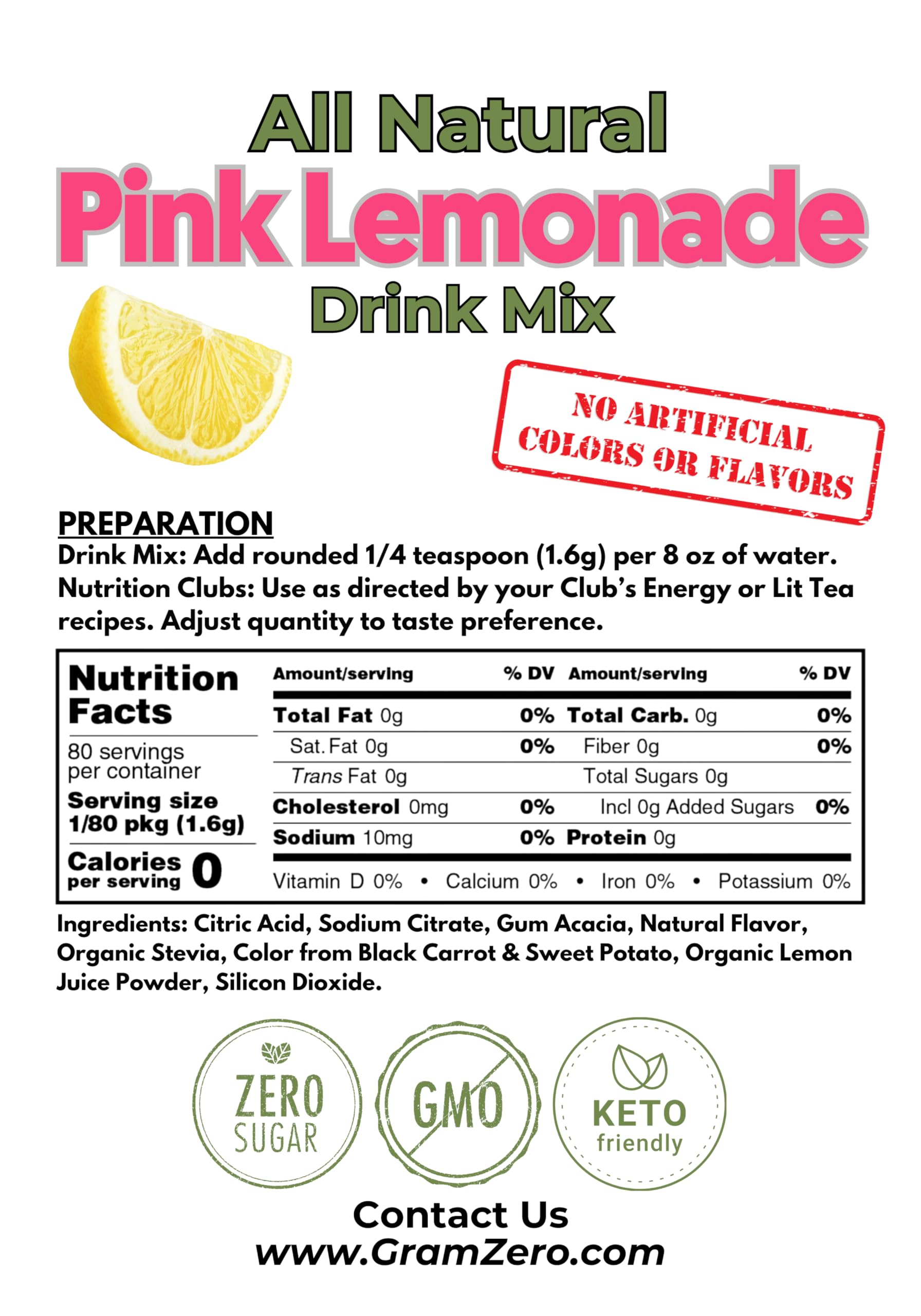 Q: What are the main ingredients in GramZero Pink Lemonade Drink Mix?A: GramZero Pink Lemonade is made with all-natural, non-GMO ingredients and is sweetened with stevia, ensuring a delicious flavor without any calories or sugar.