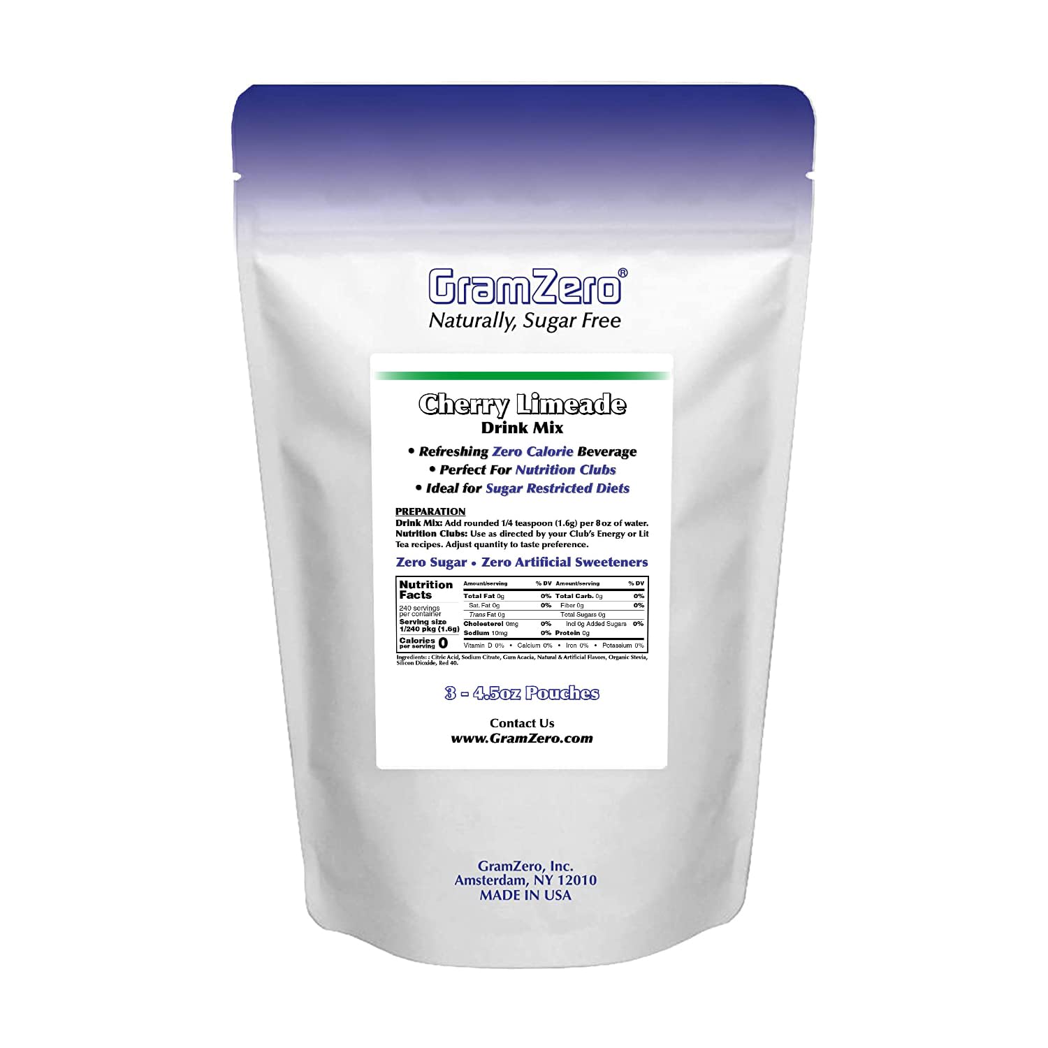 - Q: What are the main ingredients in GramZero Cherry Limeade drink mix? A: GramZero Cherry Limeade drink mix is sweetened exclusively with organic stevia, ensuring a naturally sugar-free and low-calorie beverage. It contains no artificial sweeteners or sugar alcohols, making it a healthy choice for those looking to enhance their water flavor.
