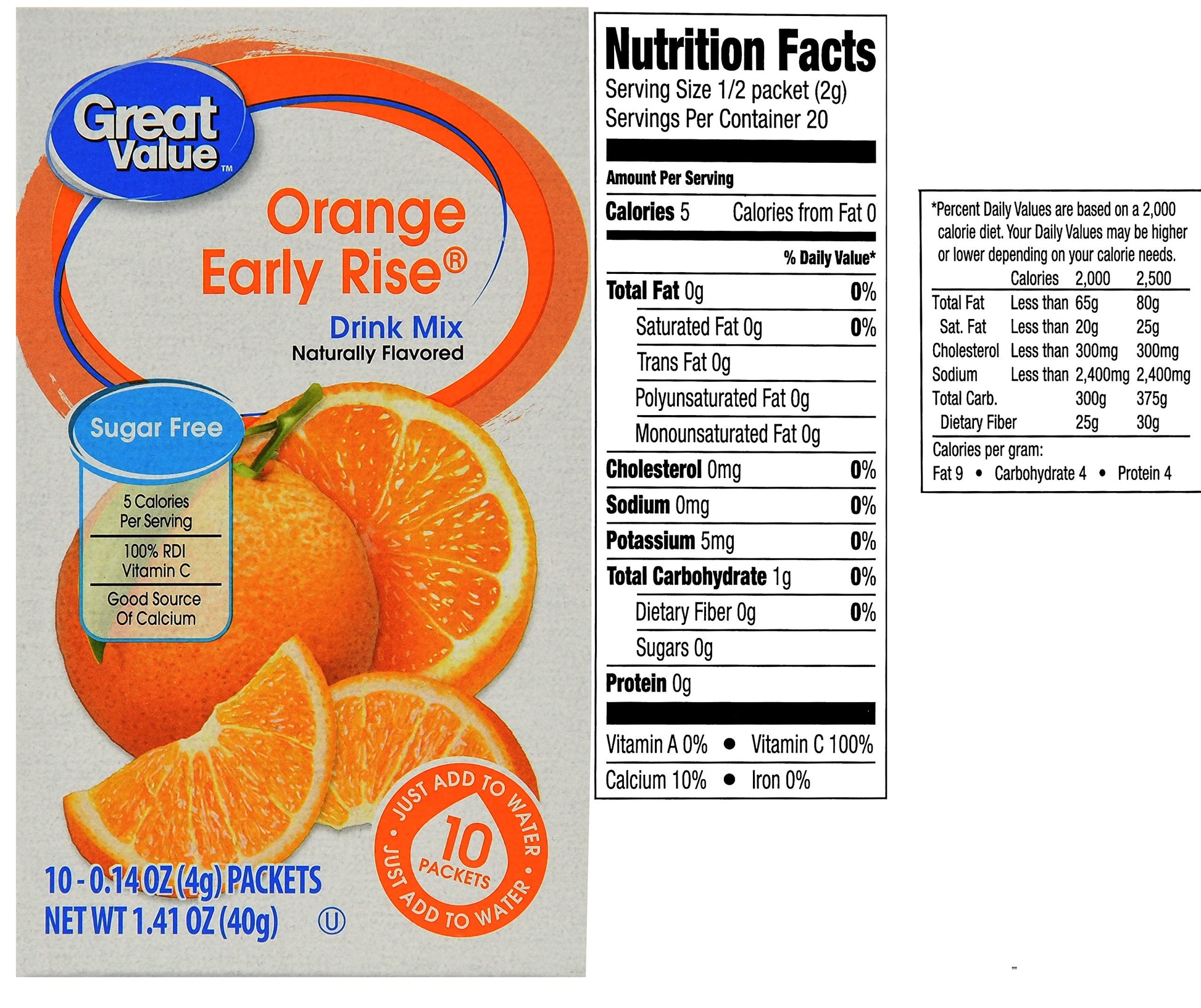 Great Value Sugar-Free Flavored Drink Mix delivers a crisp fruity flavor in every sip. This drink mix makes it easy to enjoy a healthy beverage at the gym, in the office or on the go. It is excellent for health conscious individuals as it is sugar free and only has five calories per serving. It also offers a nutritional benefits as it is an excellent source of vitamin C. This pack comes with 10 individual packets of drink mix, making it easy to stock up. Just add to water to make this flavorful beverage come to life. Feel refreshed with the exceptional taste of Great Value Sugar-Free Drink Mix.
