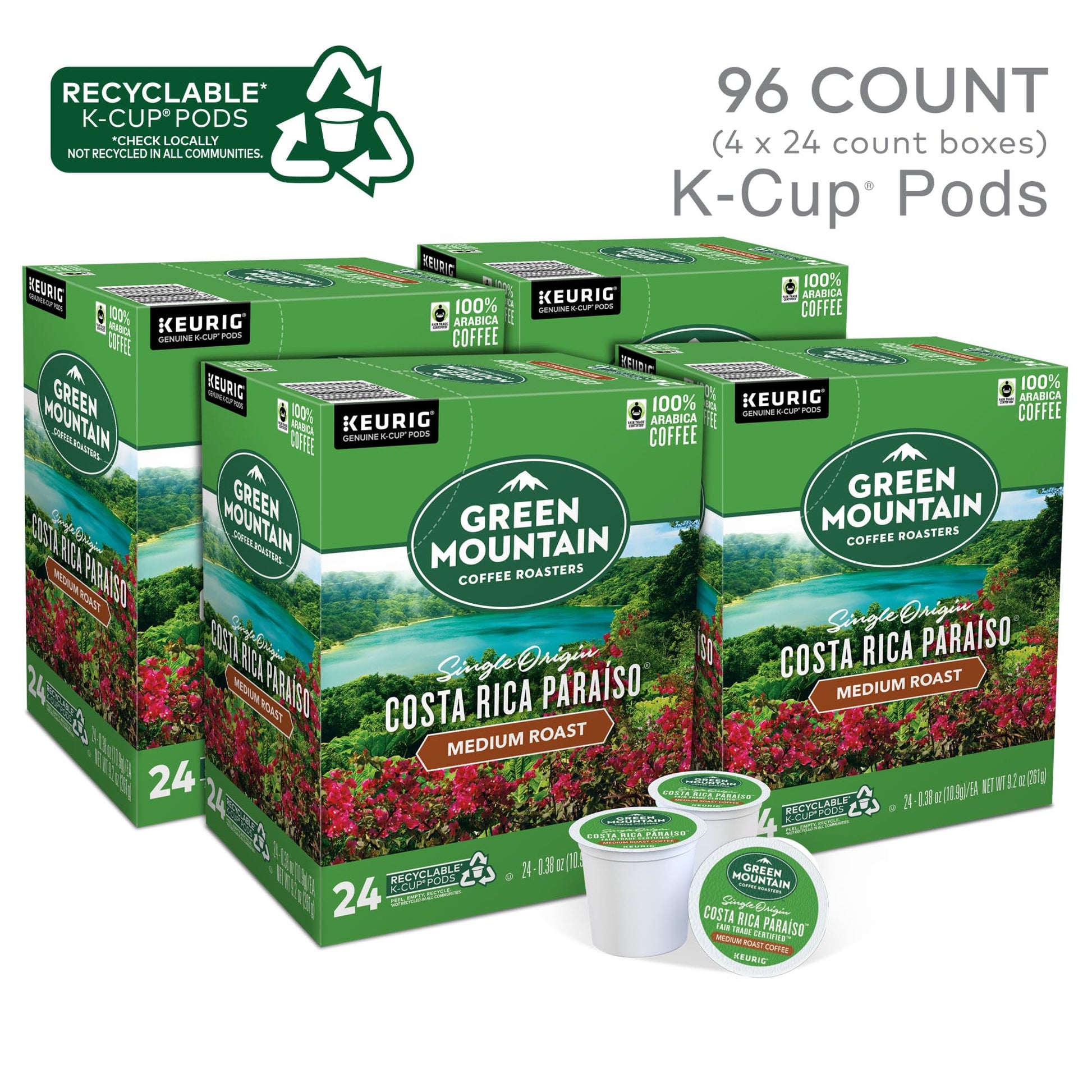 Q: What is the roast level of Green Mountain Coffee Roasters Costa Rica Paraiso K-Cup Pods?A: The Green Mountain Coffee Roasters Costa Rica Paraiso K-Cup Pods are medium roast, providing a well-balanced flavor profile that combines smooth cocoa and caramel notes.