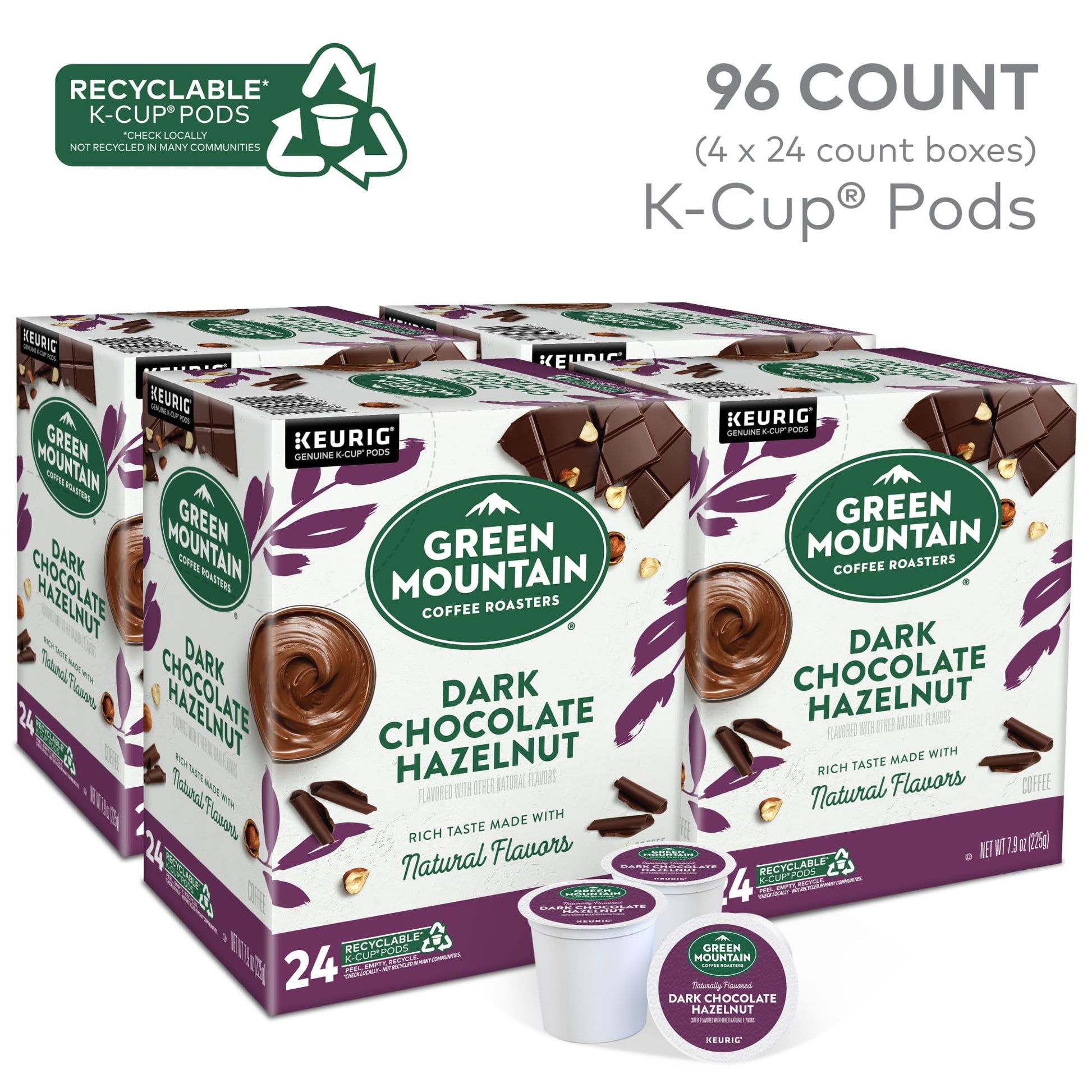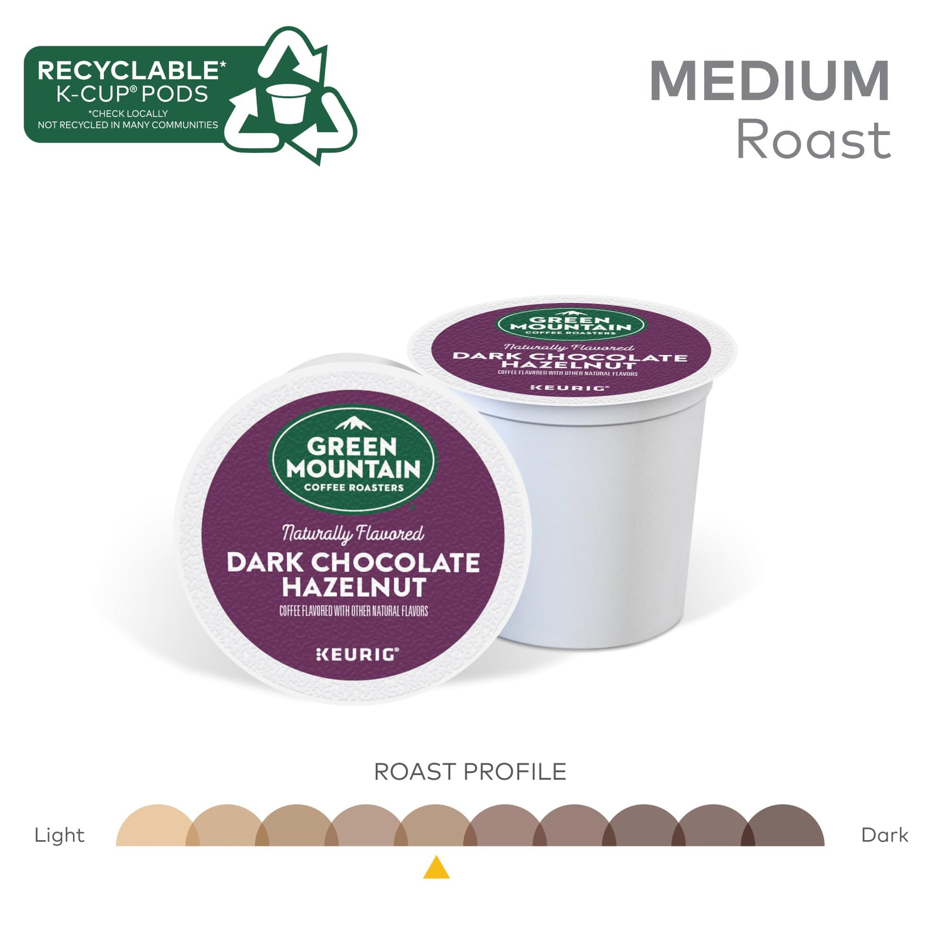 Green Mountain Coffee Roasters® proudly presents delicious Dark Chocolate Hazelnut flavored coffee made with natural flavors. Rich notes of dark cocoa pair perfectly with naturally nutty hazelnut so you can savor the season in each and every comforting cup. This medium roast flavored coffee is 100% responsibly sourced just like the entire Green Mountain Coffee Roasters® lineup. They are certified Orthodox Union Kosher and come in genuine Keurig® K-Cup® pods. Each K-Cup® pod is engineered for guaranteed quality and compatibility with all Keurig® K-Cup® pod coffee makers. Explore Green Mountain Coffee Roasters® for more inspired flavored and unflavored coffees. We are committed to improving the lands through sustainably grown coffee. We're driven to bring the world a richer, better cup of coffee. Be bold. Be alive. Grab a cup and get out there.®
