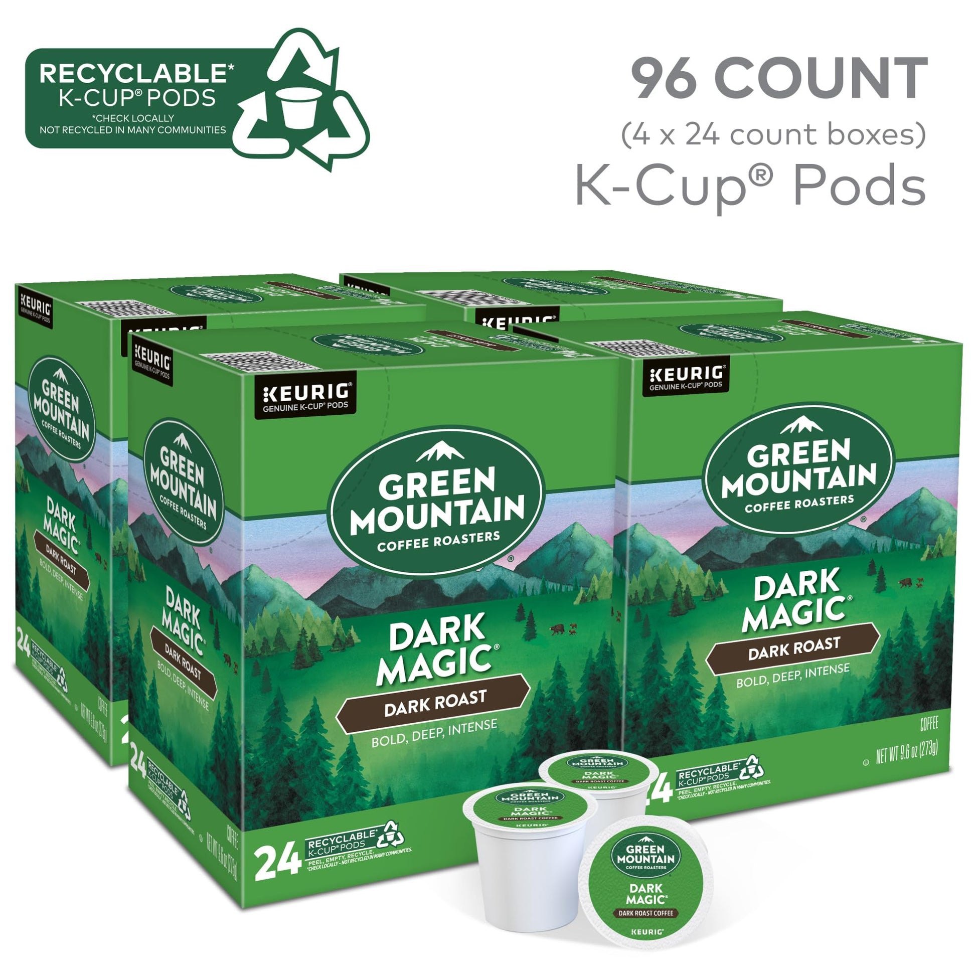 Q: Are the K-Cup pods recyclable?A: Yes, the K-Cup pods for Green Mountain Coffee Roasters Dark Magic are recyclable. After brewing, simply peel, empty, and recycle the pod, though please check local recycling guidelines as they may vary.