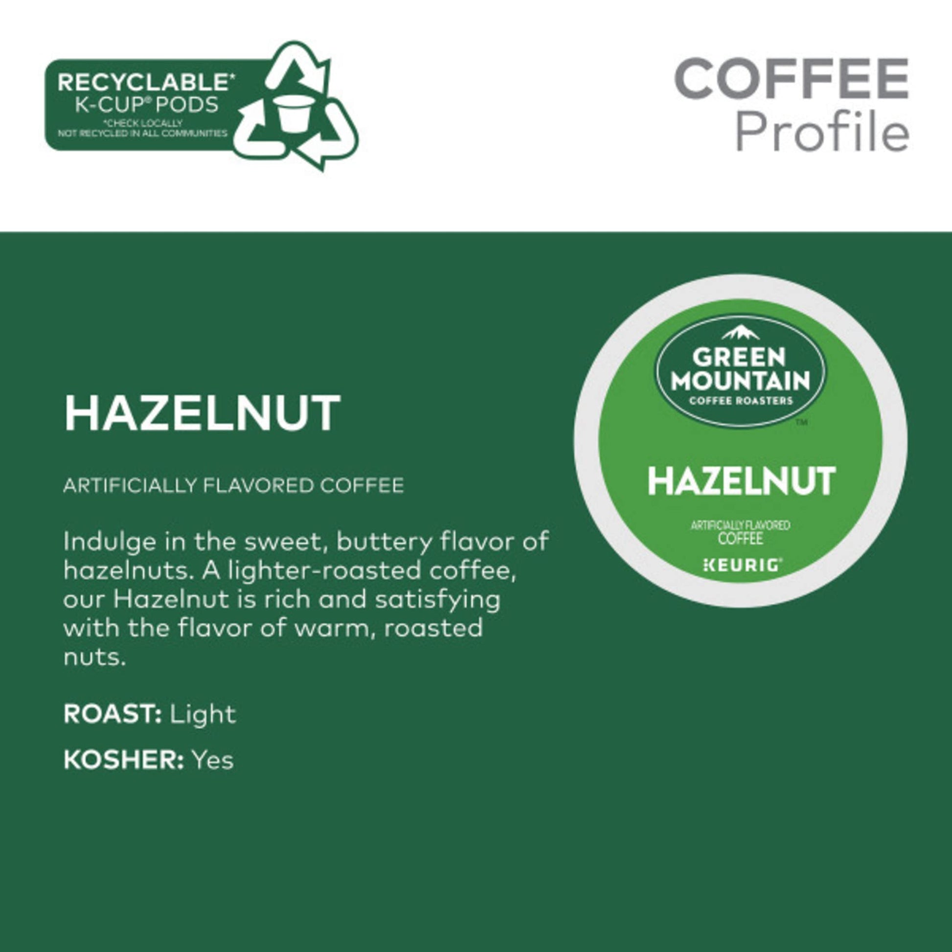 Q: What is the flavor profile of Green Mountain Coffee Roasters Hazelnut Coffee?A: Green Mountain Coffee Roasters Hazelnut Coffee features a delightful sweet and buttery flavor reminiscent of roasted hazelnuts. It is a light roast coffee that provides a rich and satisfying taste experience.
