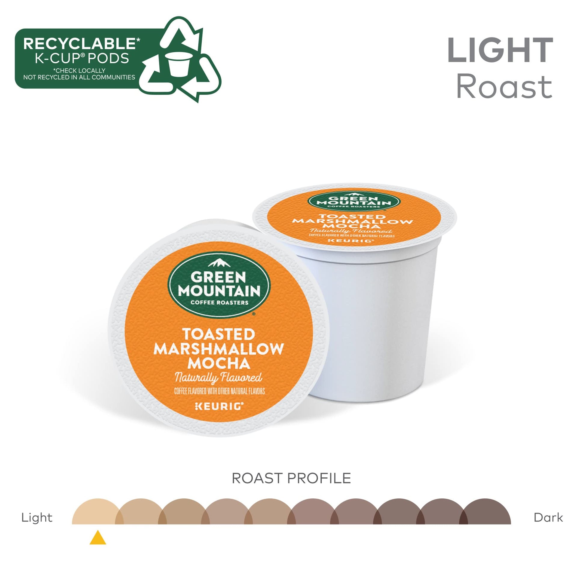 The mountains are a special place. It's where Green Mountain Coffee Roasters was born. It's where we developed our adventurous spirit and commitment to improving the lands through sustainably sourced coffee. We're driven to bring the world a richer, better cup of coffee. Be bold. Be alive. Grab a cup and get out there. Savor the familiar summer taste of fireside s’mores with Green Mountain Coffee Roasters Toasted Marshmallow Mocha. Smooth and sweetly aromatic, with the flavors of toasty, golden marshmallows and creamy chocolate. These single-serve K-Cup pods are compatible with all Keurig K-Cup Pod Single-Serve Coffee Makers. Each K-Cup pod is filled with the freshest ground coffee and brews a perfect, great tasting cup of coffee, every time. Certified Orthodox Union Kosher. What does being 100 percent responsibly sourced coffee mean? Responsibly Sourced means the coffee we purchase is grown and sold in adherence to a credible sourcing program that aligns with our company Responsible Sourcing Guidelines. Our coffee is 100 percent responsibly sourced.