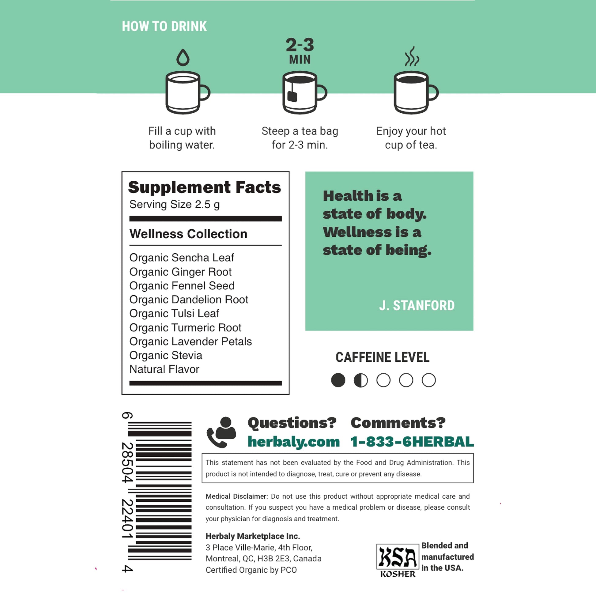Herbaly Believes In Positive Beneficial Daily Habits That Will Add Up Over The Years And Change Your Life. We Believe In Moderation, Fitness, Indulging With Loved Ones, Meditation, Adventure, Vegetable Gardens, Breaking A Sweat, And A Great Cup Of Tea To Complete The Day. We Took The Time To Research The Most Powerful Herbs For A Full Body Health Tea And Insisted On Sourcing Only Gmo Free, Organic And Vegan Ingredients. The Wellness Collection Is The Best Herbal Tea That Is Specially Formulated To Promote Overall Wellness By Helping Stimulate Your Immune System, Boost Your Metabolism, Encourage Healthy Digestion And More. Herbalys Wellness Collection Tea Is The Perfect Antidote To A Busy Lifestyle. Crammed Full Of Antioxidants And Ingredients To Boost And Protect You. Explore Why Nutritionists And Our Customers Love This Specially Formulated Blend Of Herbs! Each Cup Of Herbaly Wellness Collection Tea Is A Health-Boosting Infusion Of Organic Ingredients Including Sencha, Ginger, Fennel Seed, Dandelion Root, Turmeric, Lavender Petals And More! The Wellness Collection Tea Is Filled With Powerful Antioxidants! Benefit Packed: Appetite Control And Weight Management, Boosts Immunity, Digestion And Energy. The 8 Ingredients Inside Herbaly Also Work Together To Support A Health Inflammatory Response Along With The Many Other Benefits Creating A Wellness Cup In Just A Few Sips.