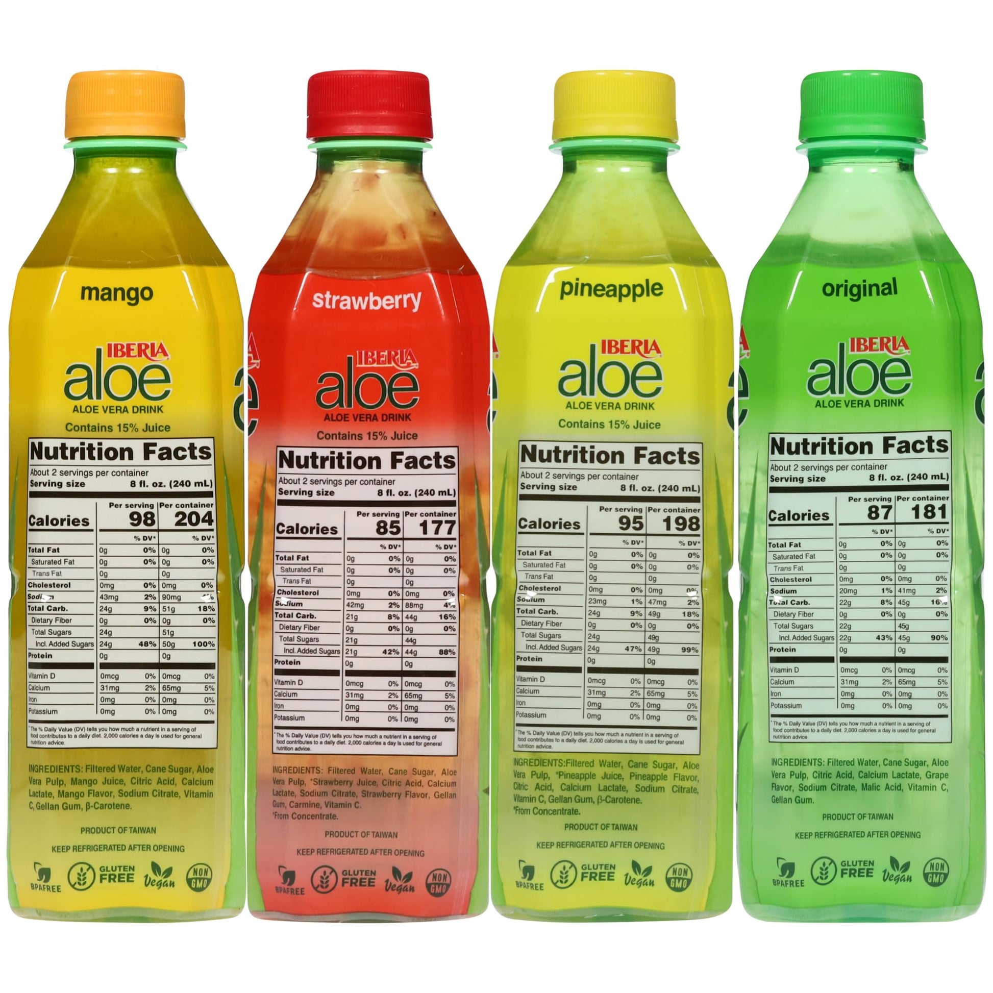 Q: What flavors are included in the Iberia Aloe Vera Drink variety pack?A: The Iberia Aloe Vera Drink variety pack includes four refreshing flavors: Original, Mango, Pineapple, and Strawberry, with two bottles of each flavor.