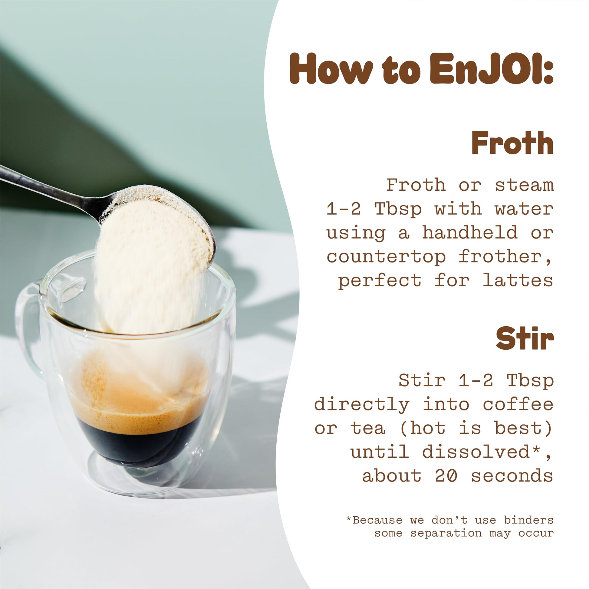 - Q: How do I use JOI Instant Oat Milk Creamer? A: To use JOI Instant Oat Milk Creamer, mix 1 to 2 heaping tablespoons directly into your hot coffee. Alternatively, you can mix with 3 fl oz of room temperature or hot water before adding it to coffee for a creamier texture. Stir for about 30 seconds to ensure it dissolves completely.