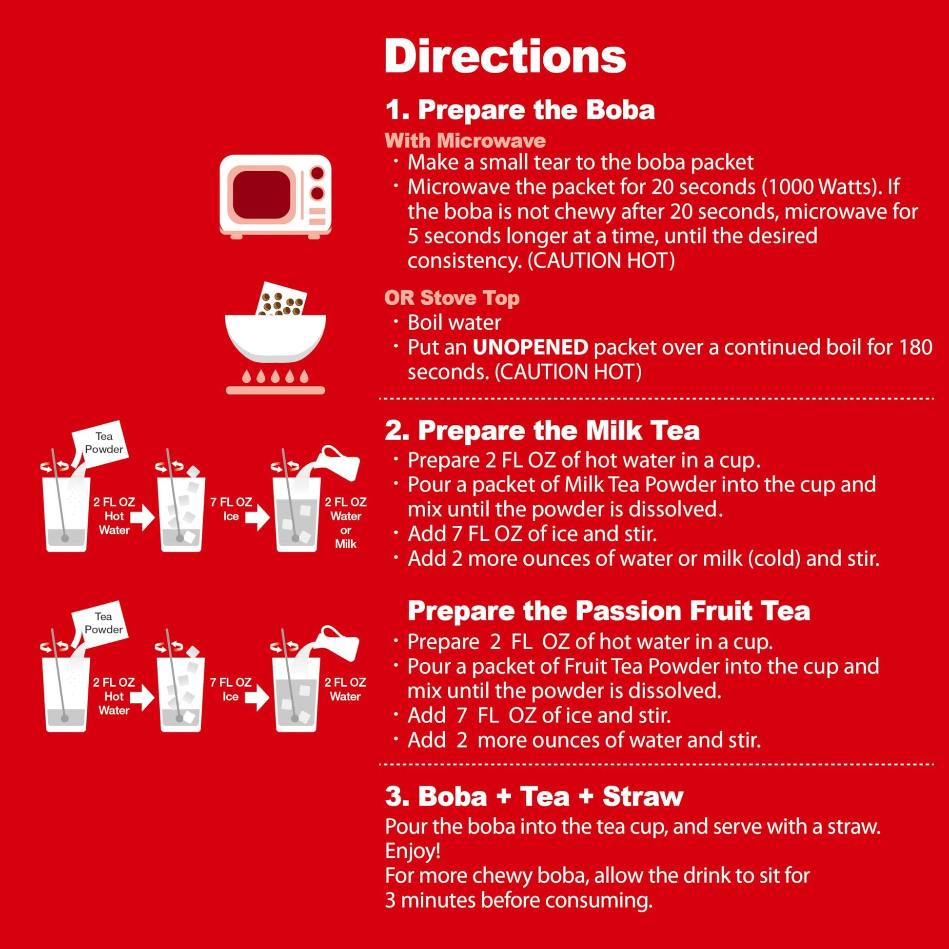Q: How do I prepare the bubble tea using this kit?A: To prepare your bubble tea, microwave the boba packet, mix hot water with the milk tea powder in a cup, then add ice, the heated boba, and a straw. The entire process takes under one minute.