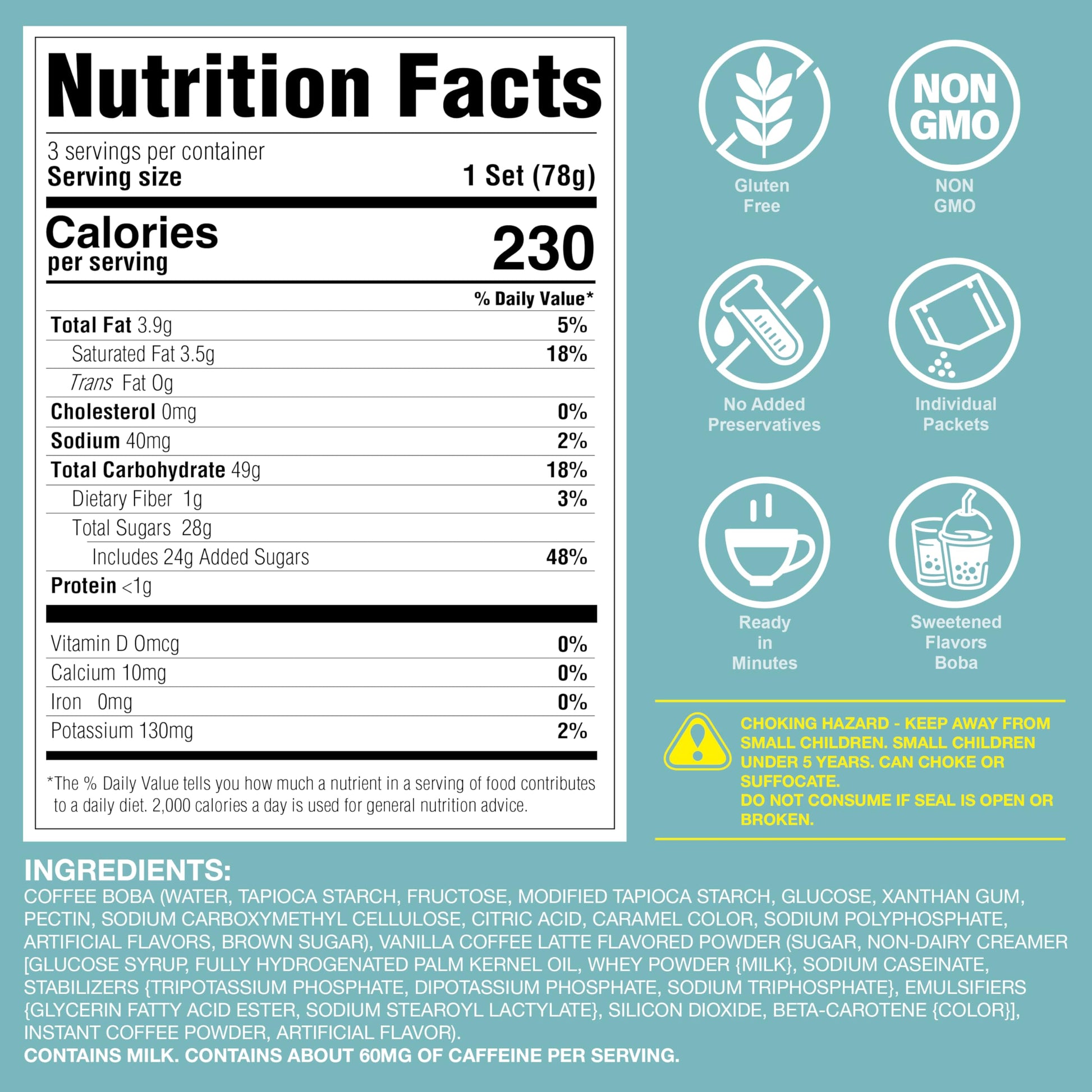 Q: What ingredients are included in the J WAY Instant Vanilla Latte Coffee Kit?A: The kit includes 3 individually wrapped portions of brown sugar boba, 3 packets of vanilla latte coffee flavored powder, and 3 extra wide paper straws. All ingredients are designed for quick and easy preparation.