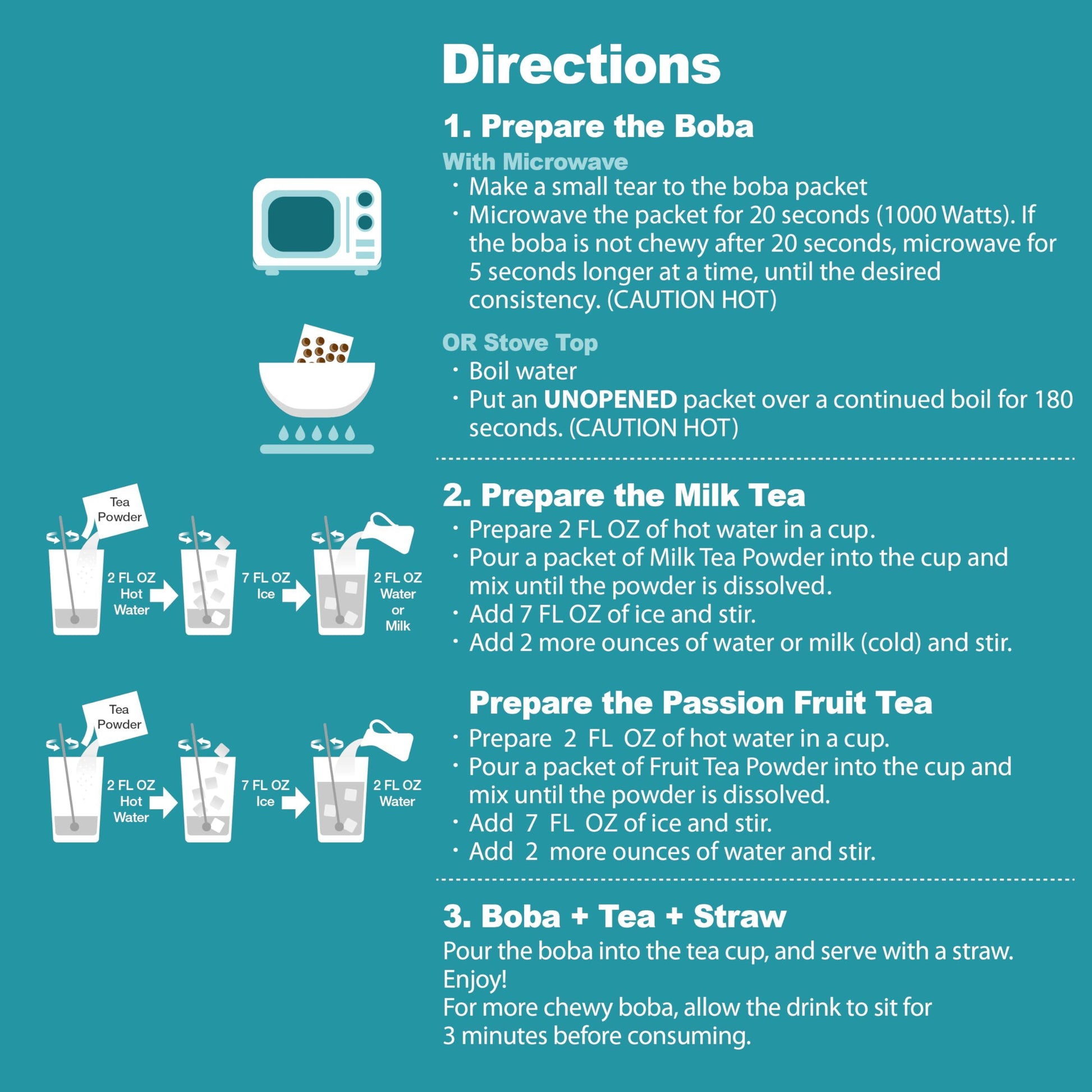 Q: How do I prepare the J WAY LOCAL FLAVOR Instant Boba Bubble Pearl kit?A: To prepare the J WAY LOCAL FLAVOR Instant Boba kit, simply microwave the boba packet according to the instructions, prepare the milk tea powder by adding hot water to a cup, and then mix in ice, the heated boba, and a straw. Enjoy your drink in under one minute!