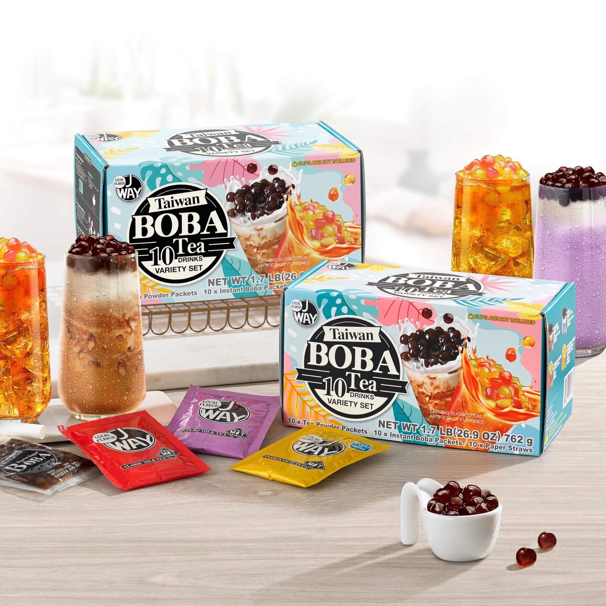 JWAY SUMMER VIBE TEA COMBO - Enjoy the refreshing and authentic Taiwanese flavor boba tea with your friends and family this summer! Perfect drinks choices when you are lounging by the pool at a party, enjoying the sun on a relaxing picnic, or simply binge-watching on a comfy sofa. | EASY TO STORE - Our boba is preservative-free and processed with the latest food technology, which enables our product to be stored in room temperature and with a shelf life of 16 months. Enjoy the authentic boba tea anytime anywhere!! | READY IN UNDER 1 MINUTE - Simply microwave the boba packet, prepare the milk tea powder by adding hot water to a cup, then add ice, heated boba, and a straw. Yay! It's ready to enjoy! | WHAT IS INSIDE - 4 packs of brown sugar boba, 6 packs of fruity boba, 2 classic milk tea packets, 2 taro milk tea packets, 3 pineapple passionfruit green tea packets, 3 mango peach black tea packets, and 10 extra wide paper straws. | GLUTEN-FREE & VEGETARIAN-FRIENDLY - JWAY boba kit offers gluten-free boba and vegetarian milk tea powder, ideal gift for your friends and family with different dietary habits to enjoy! If you are lactose intolerant or sensitive to milk products, please do not consume.