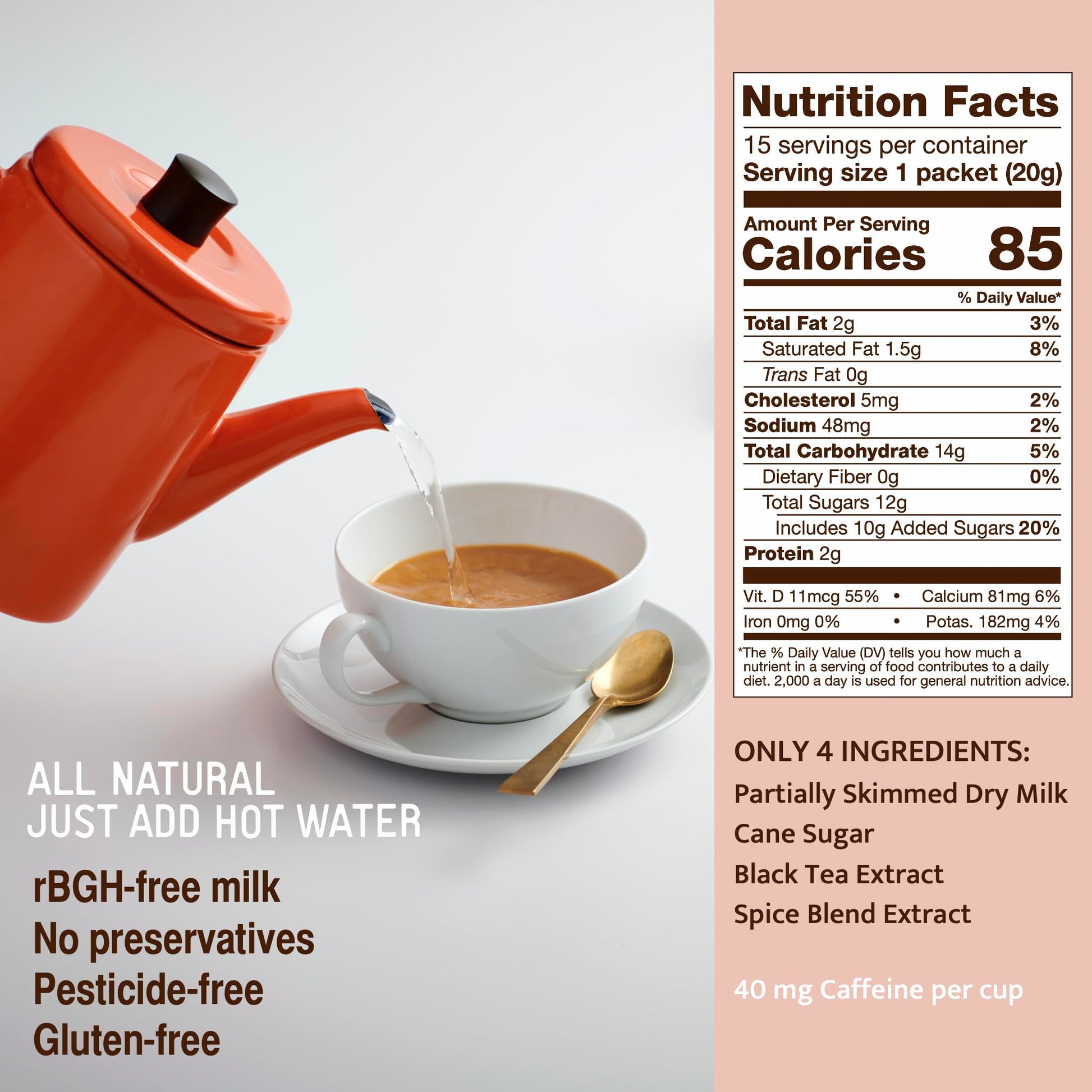 Q: What are the main ingredients in Jaipur Avenue Saffron Chai Tea Mix?A: Jaipur Avenue Saffron Chai Tea Mix is crafted with high-quality, all-natural ingredients including Assam black tea, aromatic saffron, natural cane sugar, and premium dry milk powder, ensuring a rich and authentic chai experience.
