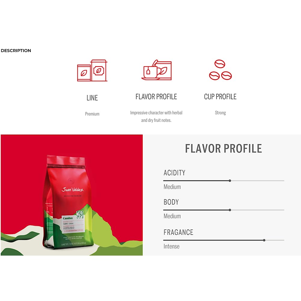 - Q: What makes Juan Valdez Cumbre Ground Coffee a premium choice? A: Juan Valdez Cumbre Ground Coffee is a premium Colombian coffee known for its expert blend of high-quality Colombian beans, delivering intense flavors complemented by herbal and dry fruit notes. This dark roast offers a strong character with medium acidity and body, making it a distinctive choice for coffee lovers.