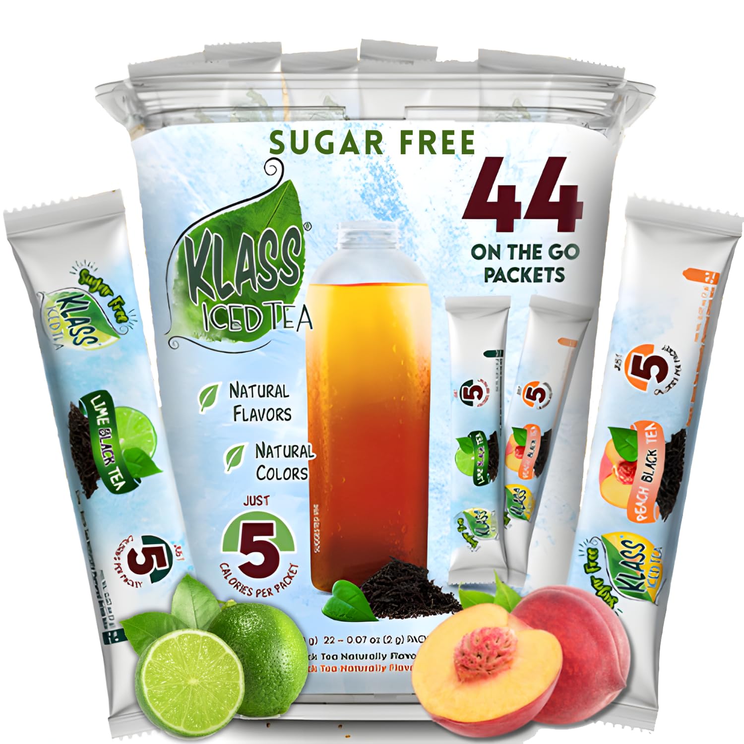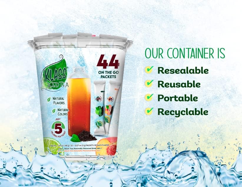 KLASS ANYTIME, ANYWHERE: The Klass brand takes pride in creating quality moments for every occasion. Take Klass Iced tea anywhere you go and always be moments away from a regreshing, natural beverage. VARIETY FOR ANY PAR-TEA: Add some variety to your everyday par-tea with this re-sealable pack containing 44 servings of Klass Iced Tea Stick Packs. Our Variety Pack is filled with 22 stick packets of each flavor. Black Lime Tea & Black Peach tea. Add one powdered drink mix packet to 16 ounces of water, shake it up, and enjoy our fun and fresh flavors. HEALTHY BLACK DECAF TEA: Brighten your afternoon with a diet zero sugar iced tea that leaves you smiling with every sip. Our full-bodied brewed black tea has a powerful punch of PEACH or LIME flavor that’s so sweet, you won’t believe there’s no sugar. HYDRATION ALTERNATIVE TO SODA: These packets are a great alternative to soda, fruit juice, or artificially flavored drinks or drink mixes— They're perfect for on-the-go adults and kids alike! Use these powdered drink mix packets as a delicious water flavoring and water flavor enhancer to help you stay hydrated and healthy throughout the day.
