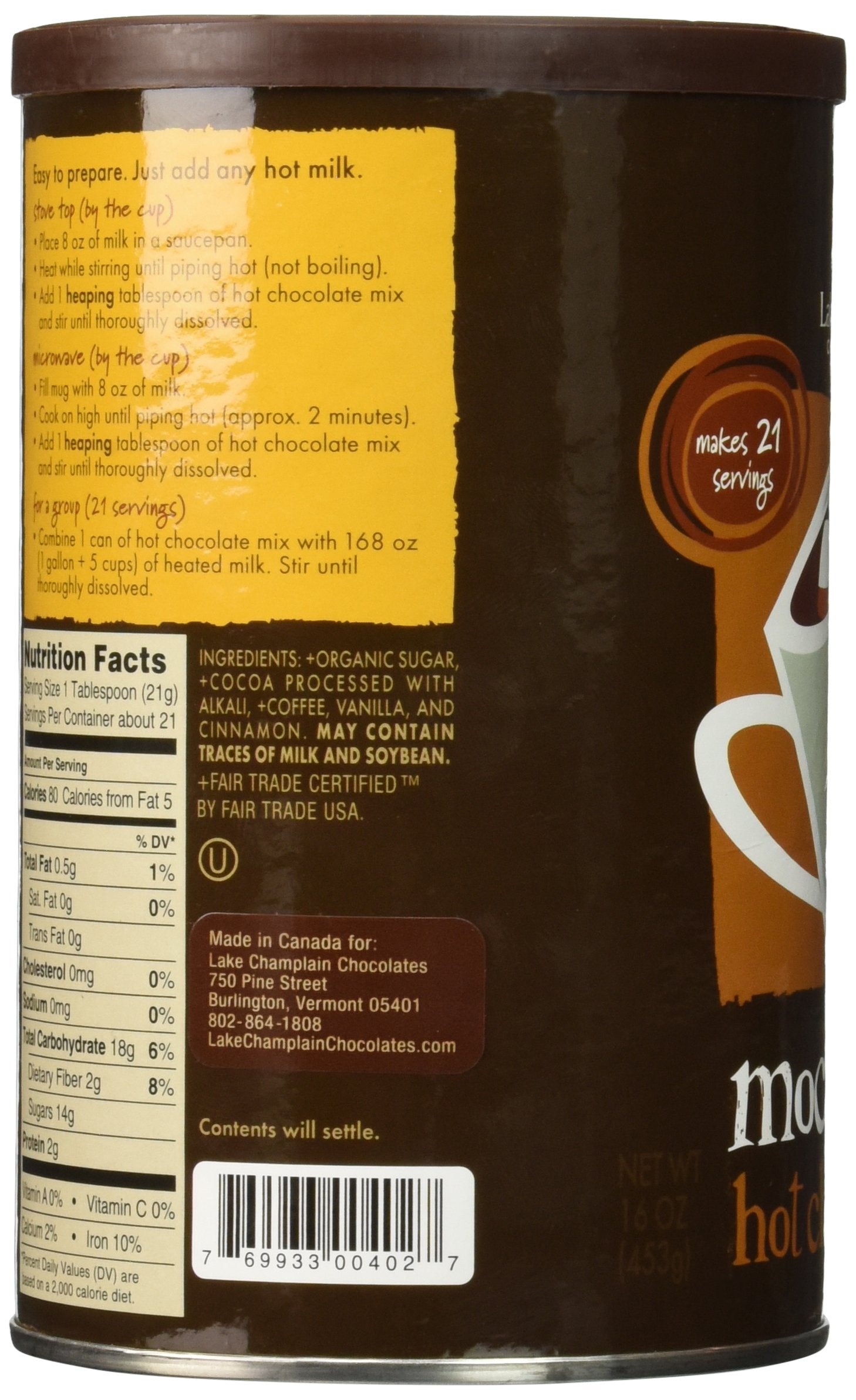 Q: What is LAKE CHAMPLAIN CHOCOLATES Mocha Hot Chocolate Mix made of?A: LAKE CHAMPLAIN CHOCOLATES Mocha Hot Chocolate Mix is crafted from high-quality chocolate combined with pure ingredients. It is designed to deliver a rich and full-bodied flavor experience.