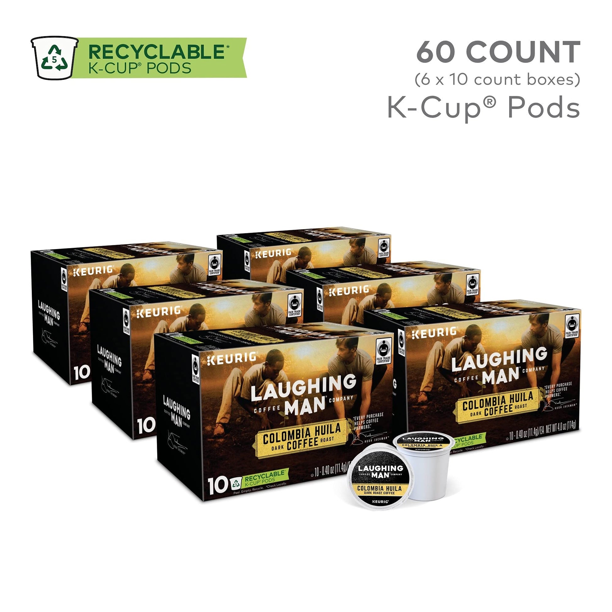 Every purchase helps coffee farmers. A dark roast coffee of uncommon complexity, our Laughing Man Colombia Huila is produced from beans of great character, resulting in an intense deep-roasted flavor, black cherry sweetness, and a dark chocolate finish. These single-serve K-Cup pods are compatible with all Keurig K-Cup Pod Single-Serve Coffee Makers. Each K-Cup pod is filled with the freshest ground coffee and brews a perfect, great tasting cup of coffee, every time. 100% Arabica, Fair Trade and Certified Orthodox Union Kosher coffee. Laughing Man Coffee is now available in a recyclable K-Cup pod. Features Dark. Smoky. Sweet. Dark Roast, Caffeinated Coffee Fair Trade Certified Orthodox Union Kosher Single Origin: Huila, Colombia Made with Arabica Coffee Laughing Man Coffee is now available in a recyclable K-Cup pod Compatible with Keurig K-Cup pod single-serve coffee makers.