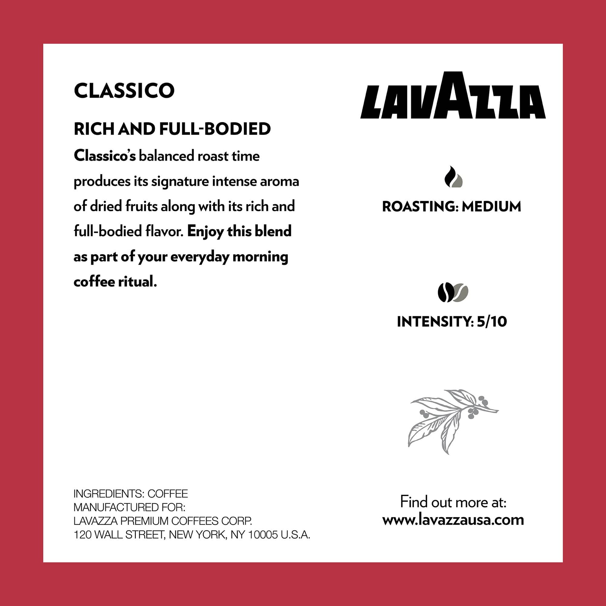 Q: What type of coffee is in Lavazza SingleServe Coffee K-Cups?A: The Lavazza SingleServe Coffee K-Cups feature the Classico coffee blend, which is a full-bodied medium roast enriched with rich flavors and notes of dried fruit.