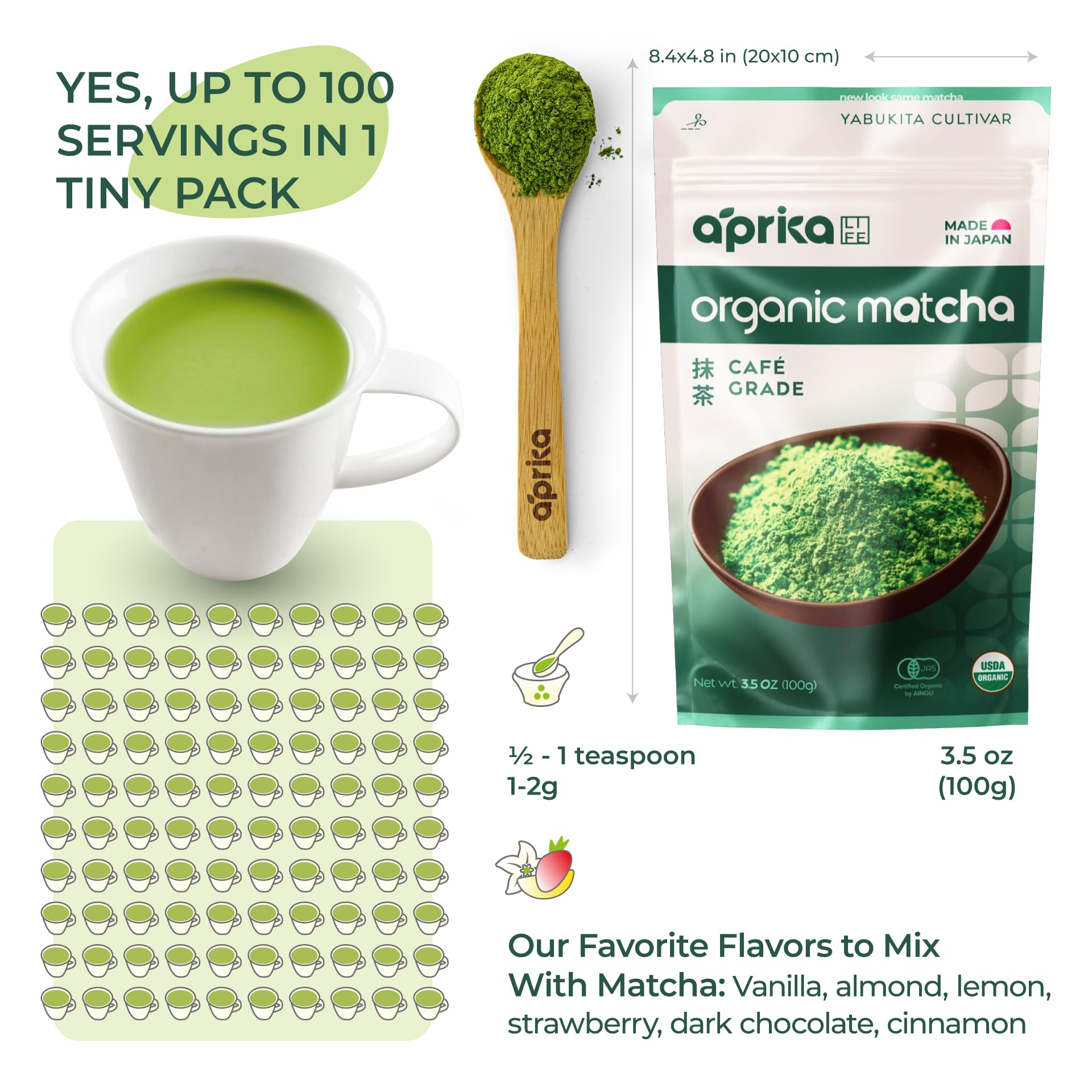 - Q: How long does a 3.5 oz package of matcha last? A: A 3.5 oz package of AprikaLife matcha powder typically lasts about a month when consuming 1-2 cups per day, with each cup requiring approximately 1 teaspoon (2 grams) of matcha. This ensures a steady supply of your favorite organic matcha.