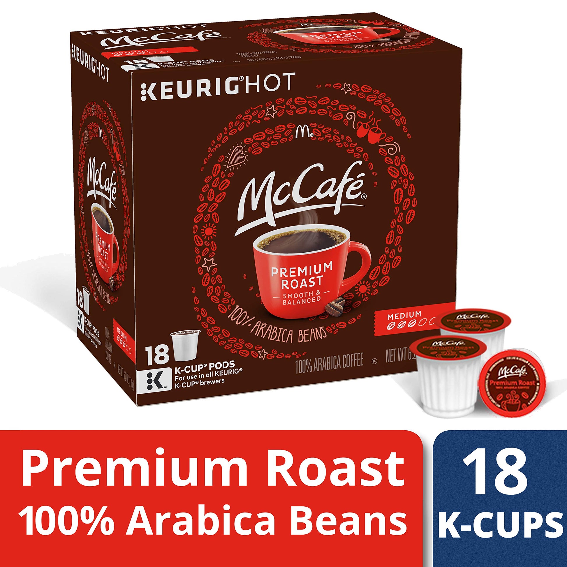 McCafe Premium Roast Medium Coffee K-Cup Pods let you enjoy the McCafe experience at home or at work. Delivering a smooth and balanced flavor, this delicious medium roast coffee is perfect for sipping throughout the day. This 100% Arabica coffee is carefully harvested from the rich soils and mountainous regions of Central and South America. Brew a cup of McCafe premium roast coffee in all Keurig 1.0 & 2.0 brewing systems. This 6.2 ounce box of K Cups includes 18 individually sealed pods for single-serve brewing. Try McCafe and experience the McDonalds coffee experience and taste in the comfort of your own home.