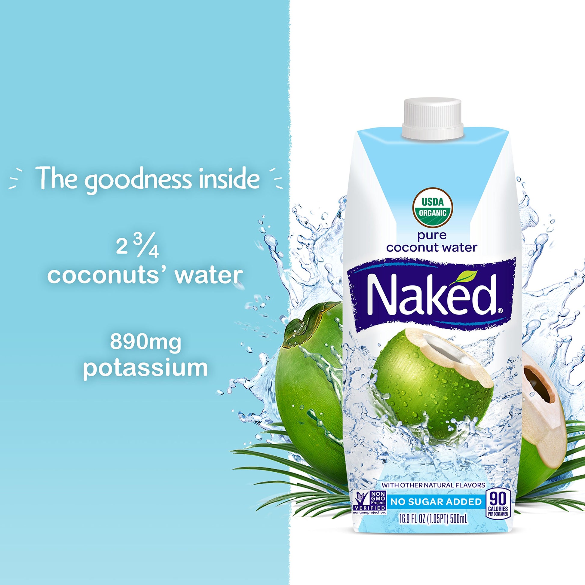 • Q: What are the health benefits of drinking Naked Juice 100% Organic Pure Coconut Water? A: Naked Juice 100% Organic Pure Coconut Water is packed with potassium and other electrolytes, making it an excellent beverage for hydration and replenishment after physical activity. It is also USDA Organic Certified and NON GMO Project Verified, ensuring you are consuming a product free from artificial additives.