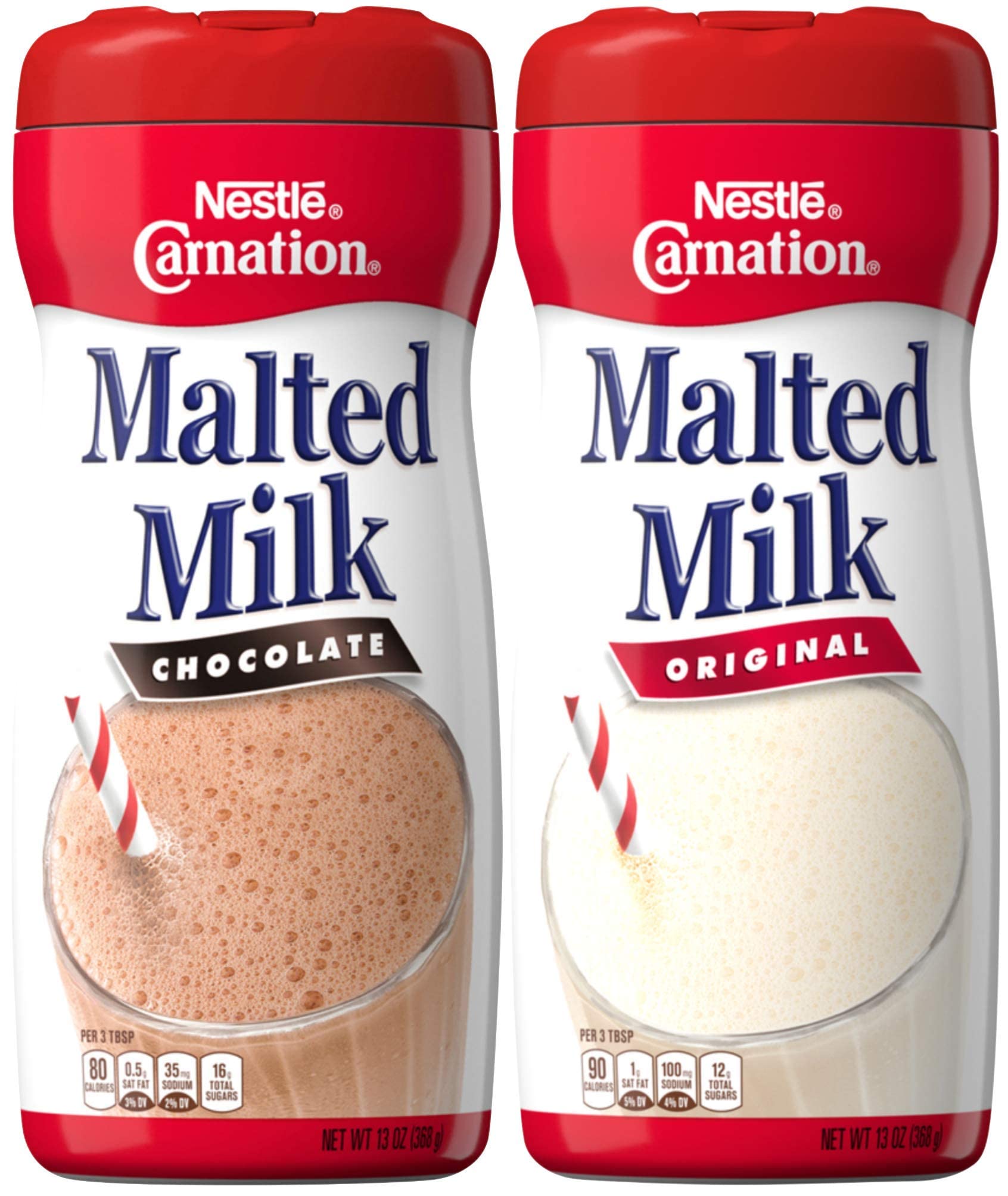 1 - 13 oz canister of Nestlé Carnation Original Malted Milk Mix 1 - 13 oz canister of Nestlé Carnation Chocolate Malted Milk Mix