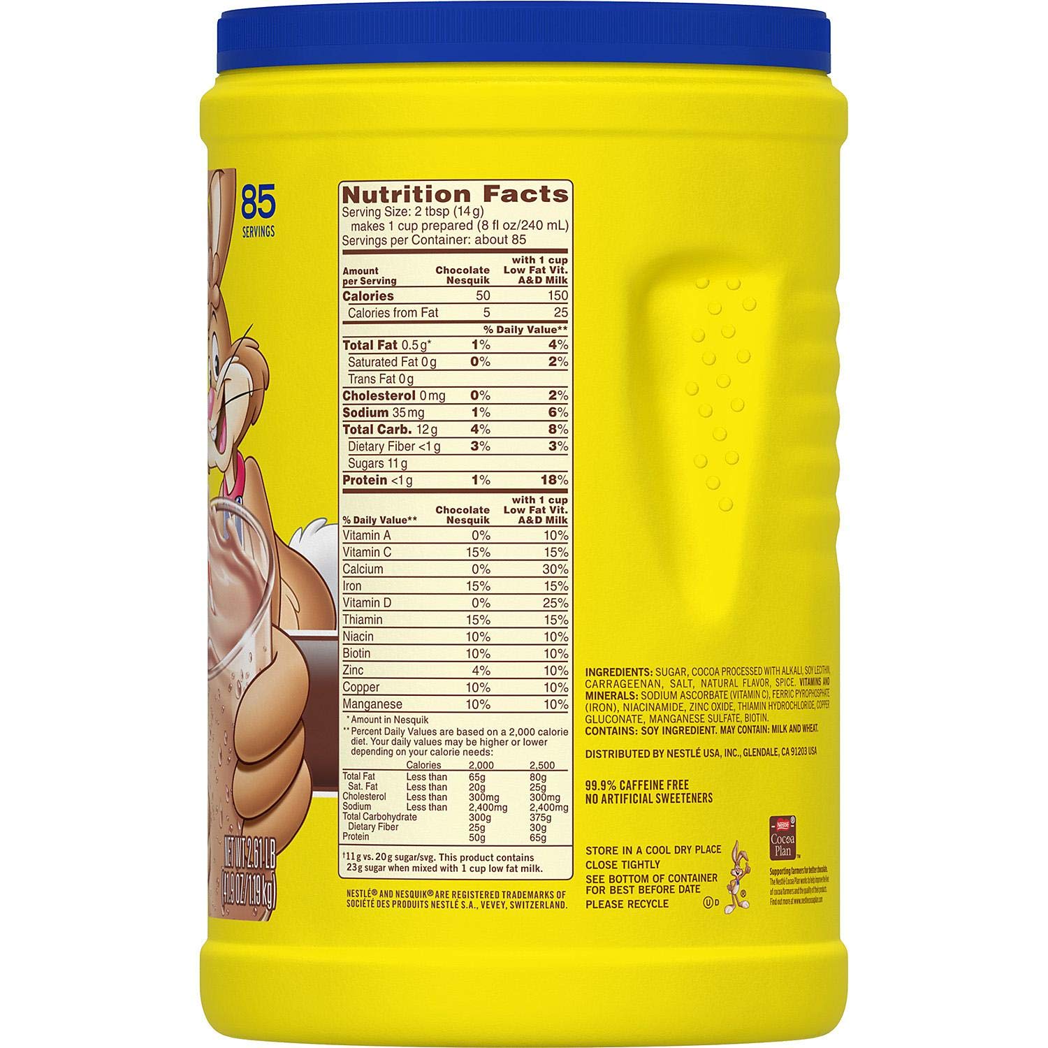 Q: Does this chocolate powder contain any artificial colors or flavors?A: No, the Nestle Nesquick Chocolate Flavored Powder does not contain any artificial colors or flavors, making it a great choice for those looking for a more natural chocolate drink mix.